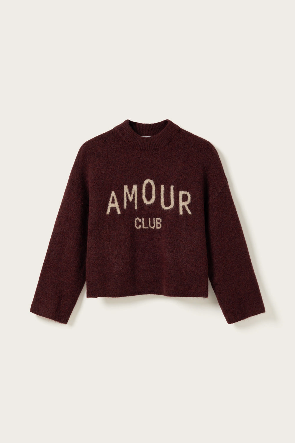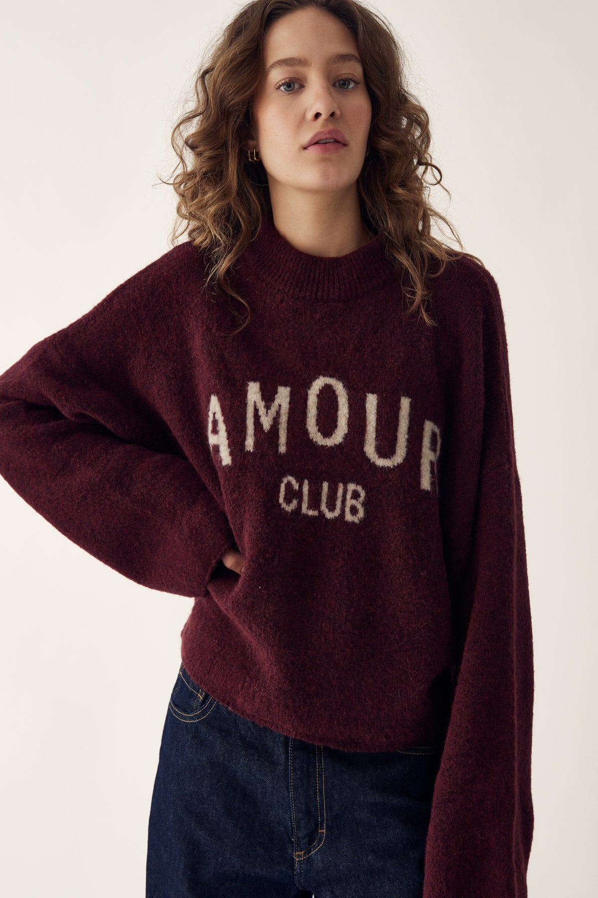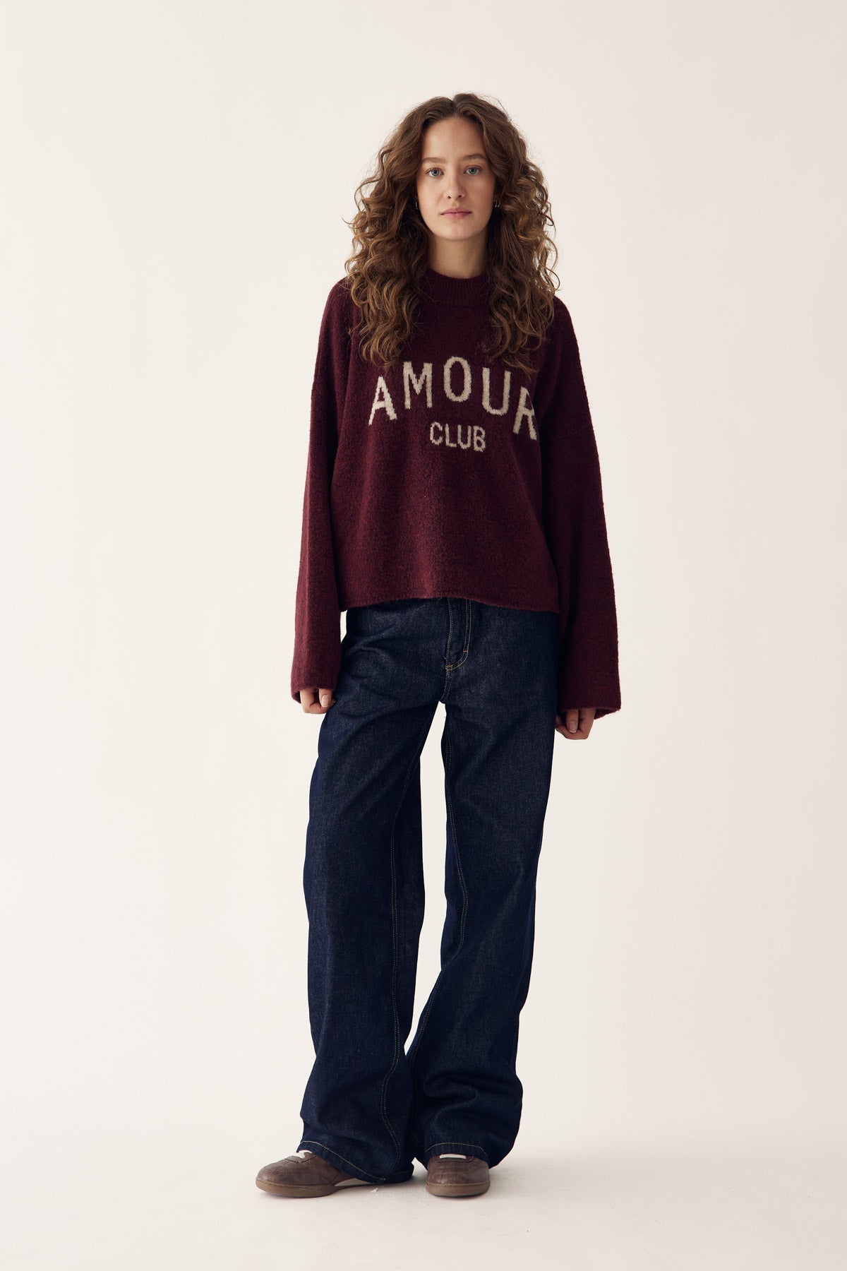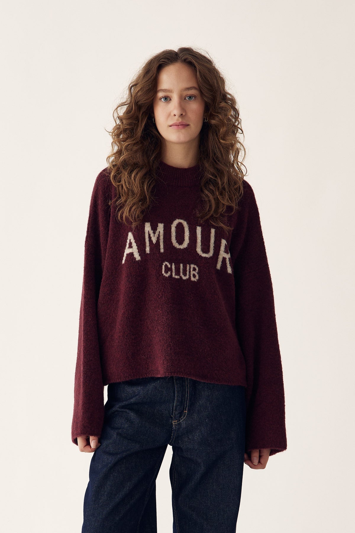 Amour Club Knit ist ein oversized Pullover mit dem Schriftzug ‘Amour Club’ vorne. Die bequeme Passform macht ihn ideal für den Alltag und lässt sich mühelos mit Jeans oder eleganten Hosen für einen lässig-eleganten Look kombinieren.