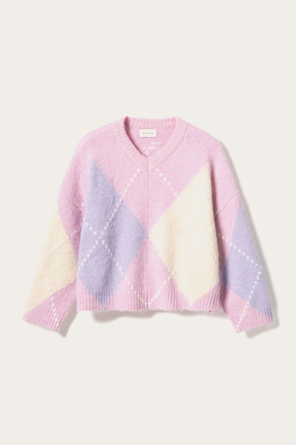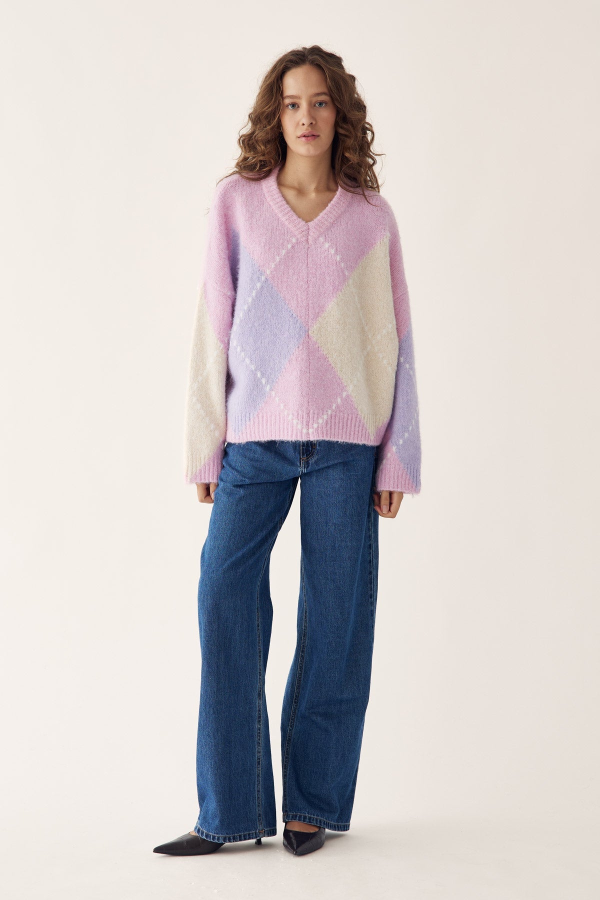 Lai Knit ist ein klassischer Pullover mit Argyle-Muster. Mit V-Ausschnitt, langen voluminösen Ärmeln und lockerer Passform für einen edlen und zeitlosen Look. Ein Statement-Piece in der Garderobe, das sich mit Jeans, einer eleganten Hose oder einem Rock stylen lässt.