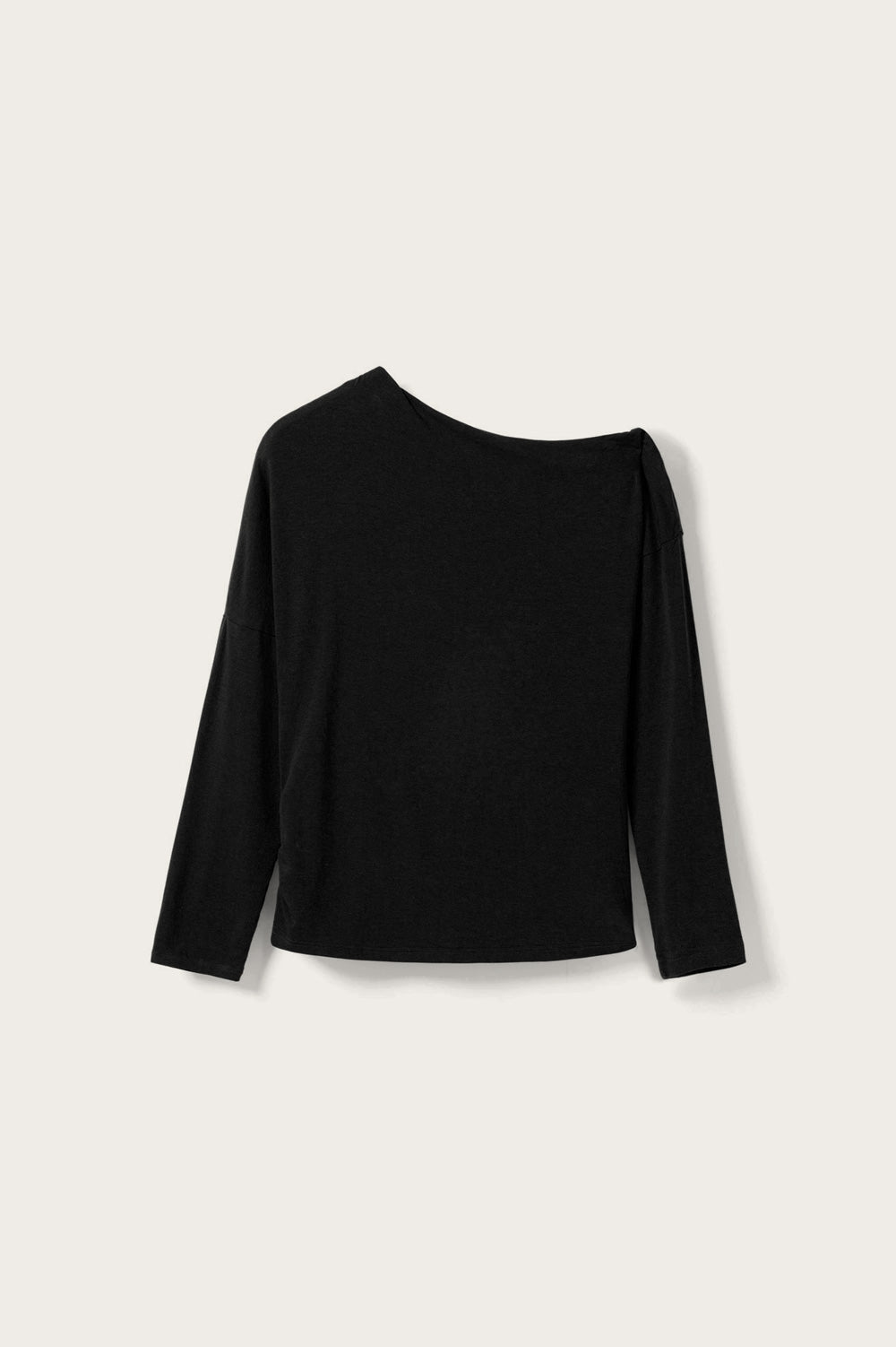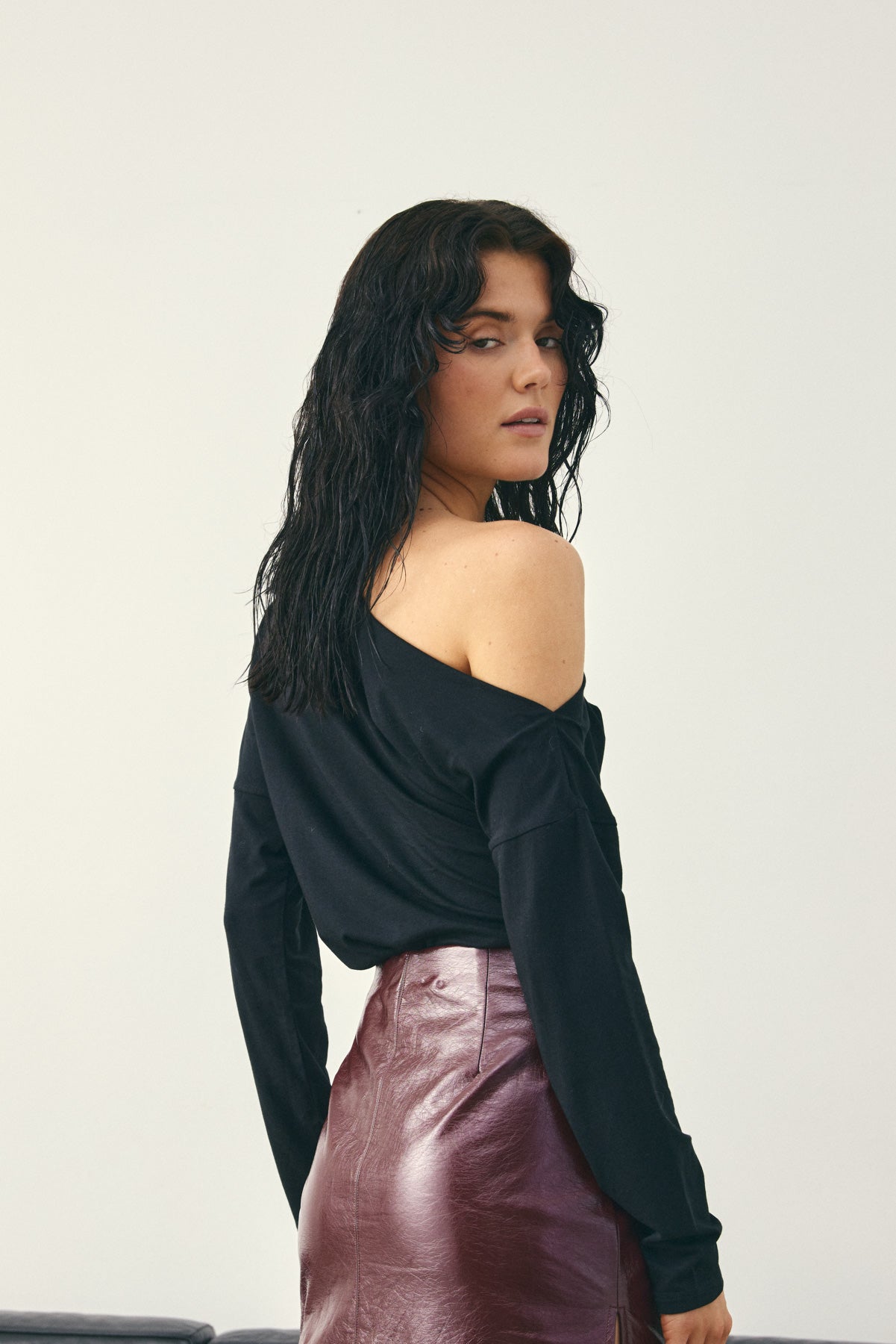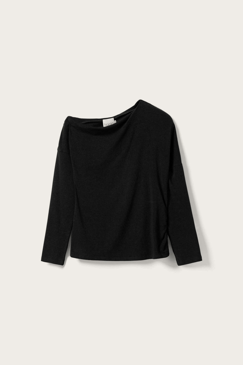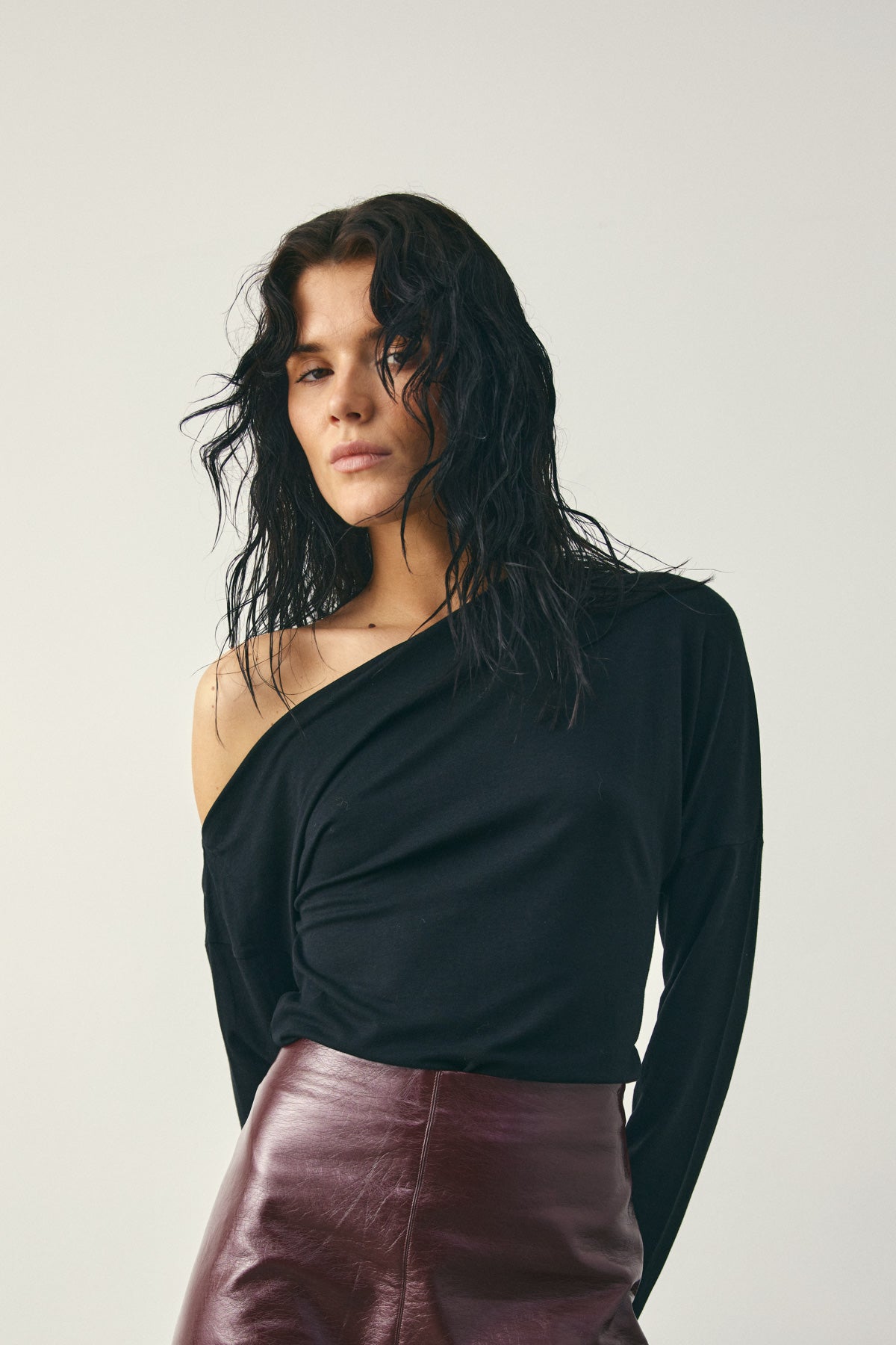 Lanna Top ist eine langärmelige Bluse mit asymmetrischem Schnitt an der rechten Schulter und figurbetonter Passform, die sich sowohl im Alltag als auch zu festlichen Anlässen leicht stylen lässt.