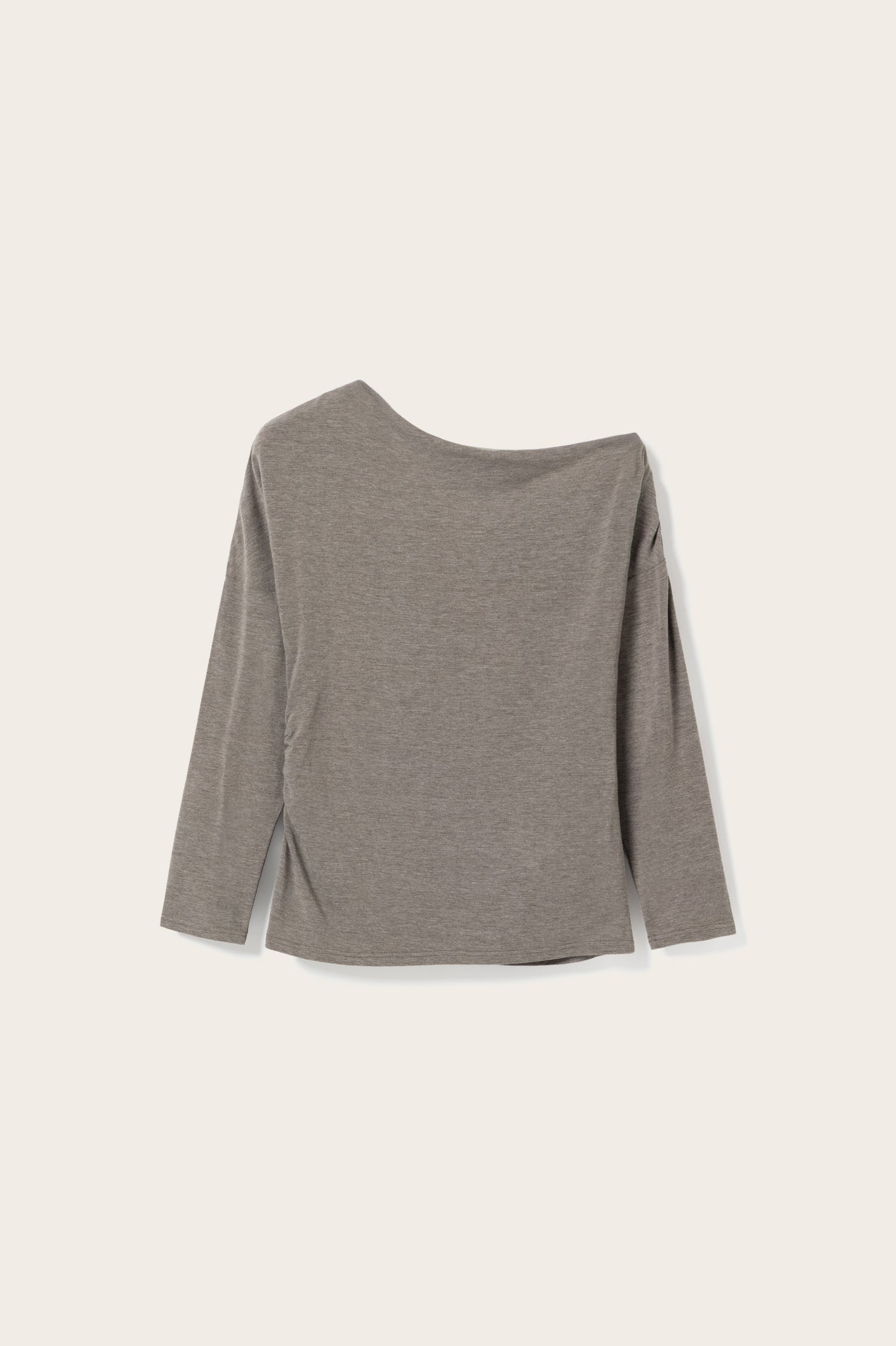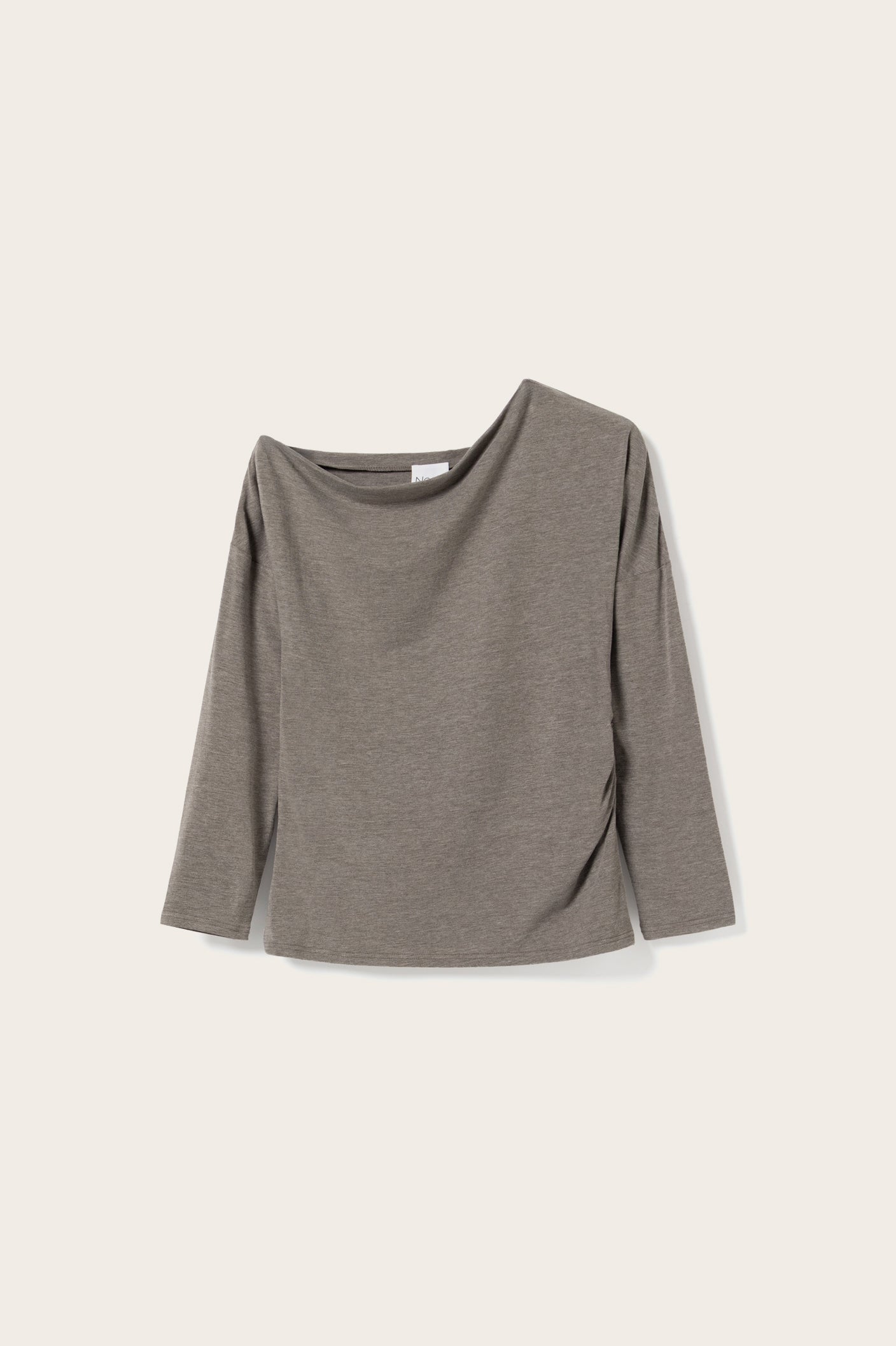 Lanna Top ist eine langärmelige Bluse mit asymmetrischem Schnitt an der rechten Schulter und figurbetonter Passform, die sich sowohl im Alltag als auch zu festlichen Anlässen leicht stylen lässt.