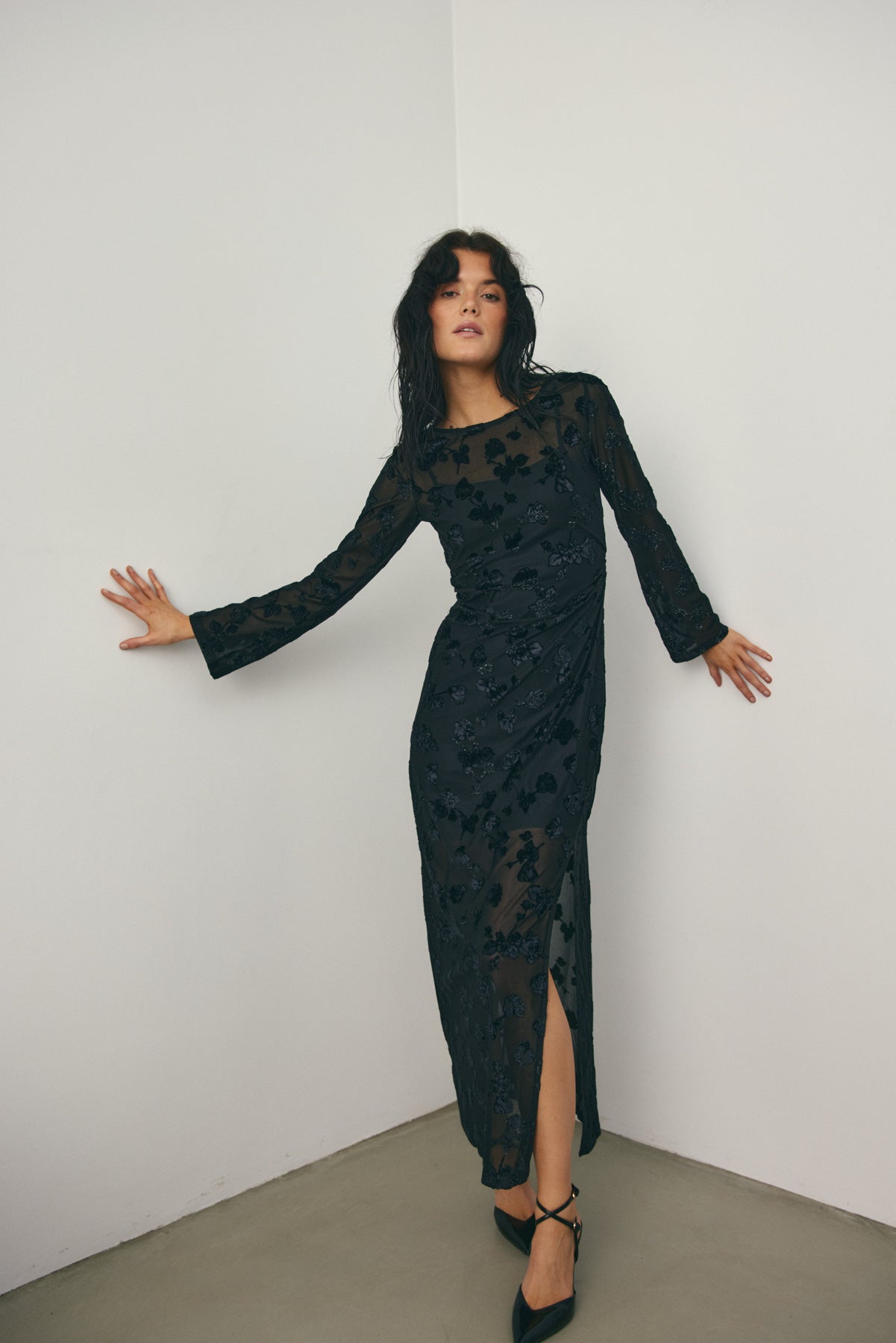 Laurette Dress ist ein langes Kleid mit langen Ärmeln und einem Seitenschlitz. Blumenprints im Stoff verleihen einen exklusiven Look. Mit High Heels und einer eleganten Tasche zu festlichen Anlässen stylen für einen stilvollen Auftritt.