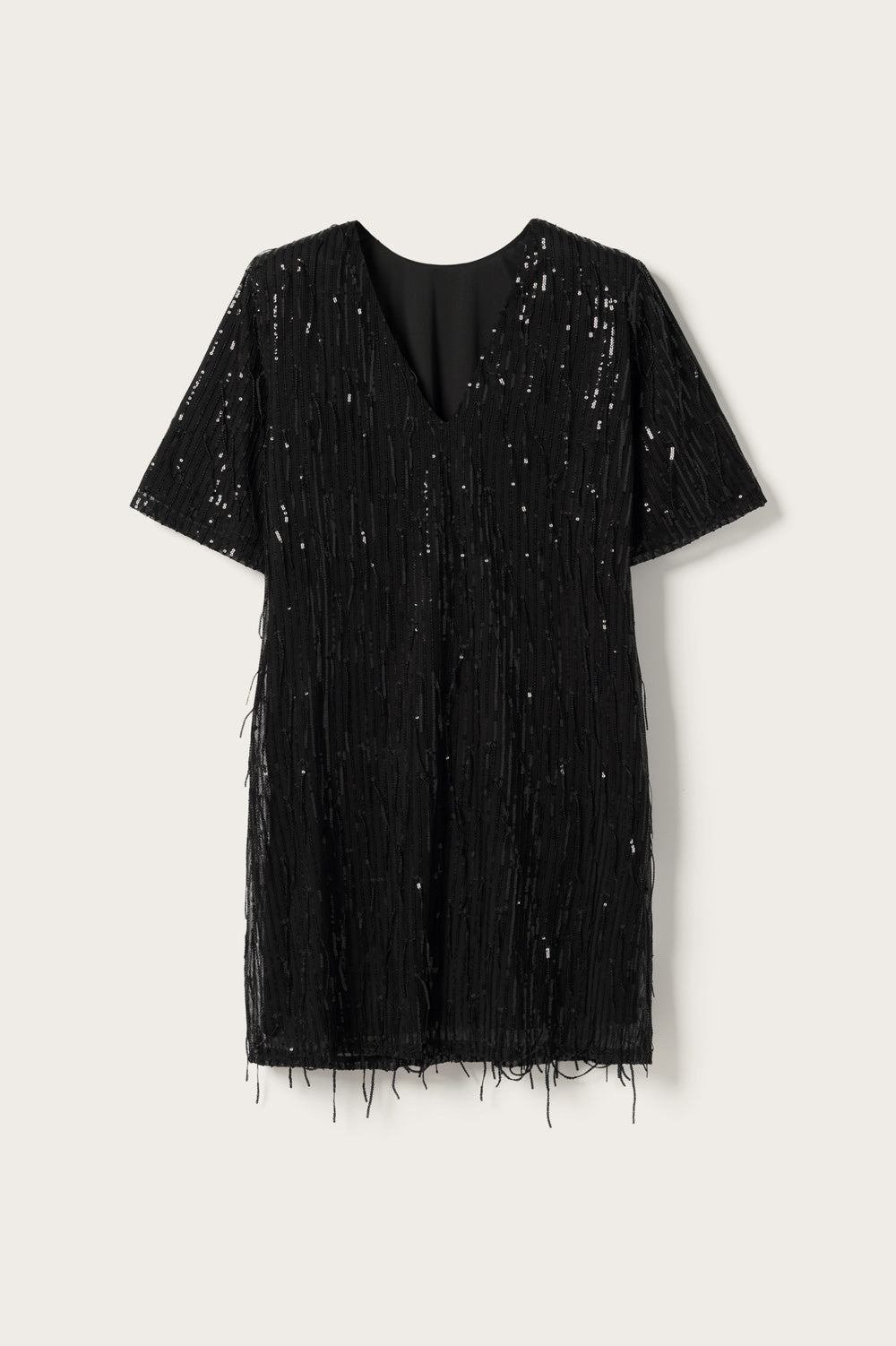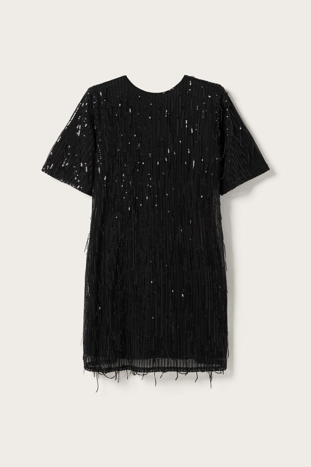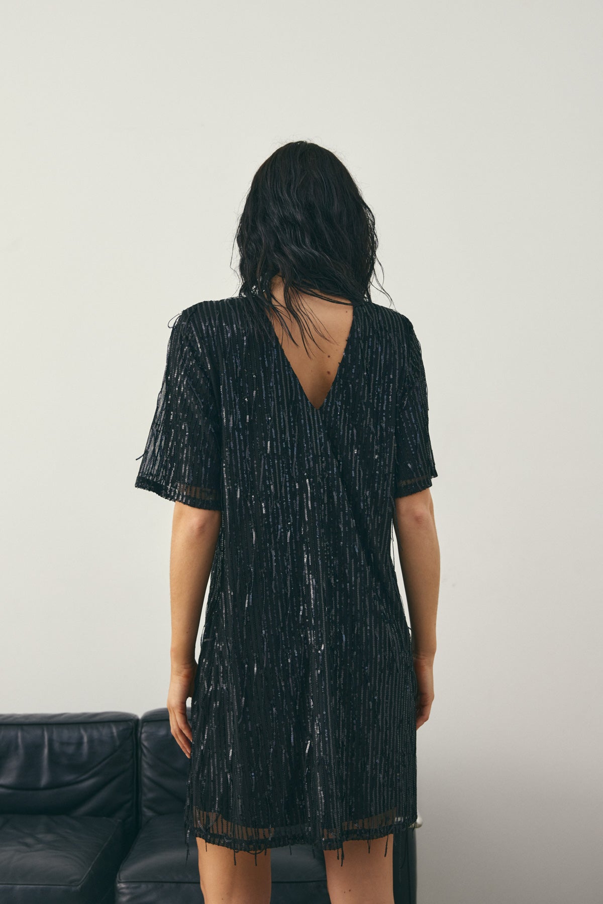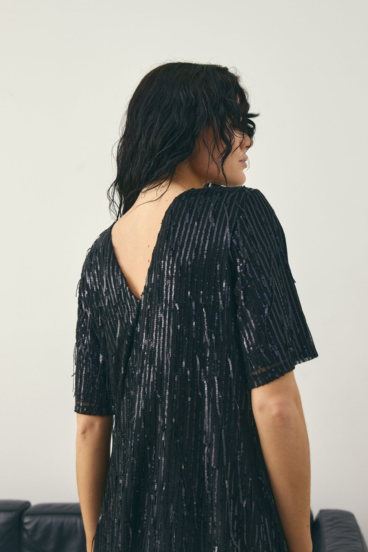Leeann Dress ist ein kurzes T-Shirt-Kleid mit Pailletten und tiefem V-Ausschnitt am Rücken. Leeann Dress ist perfekt für festliche Anlässe und lässt sich mit High Heels und einer coolen Tasche für einen stilvollen Partylook kombinieren.