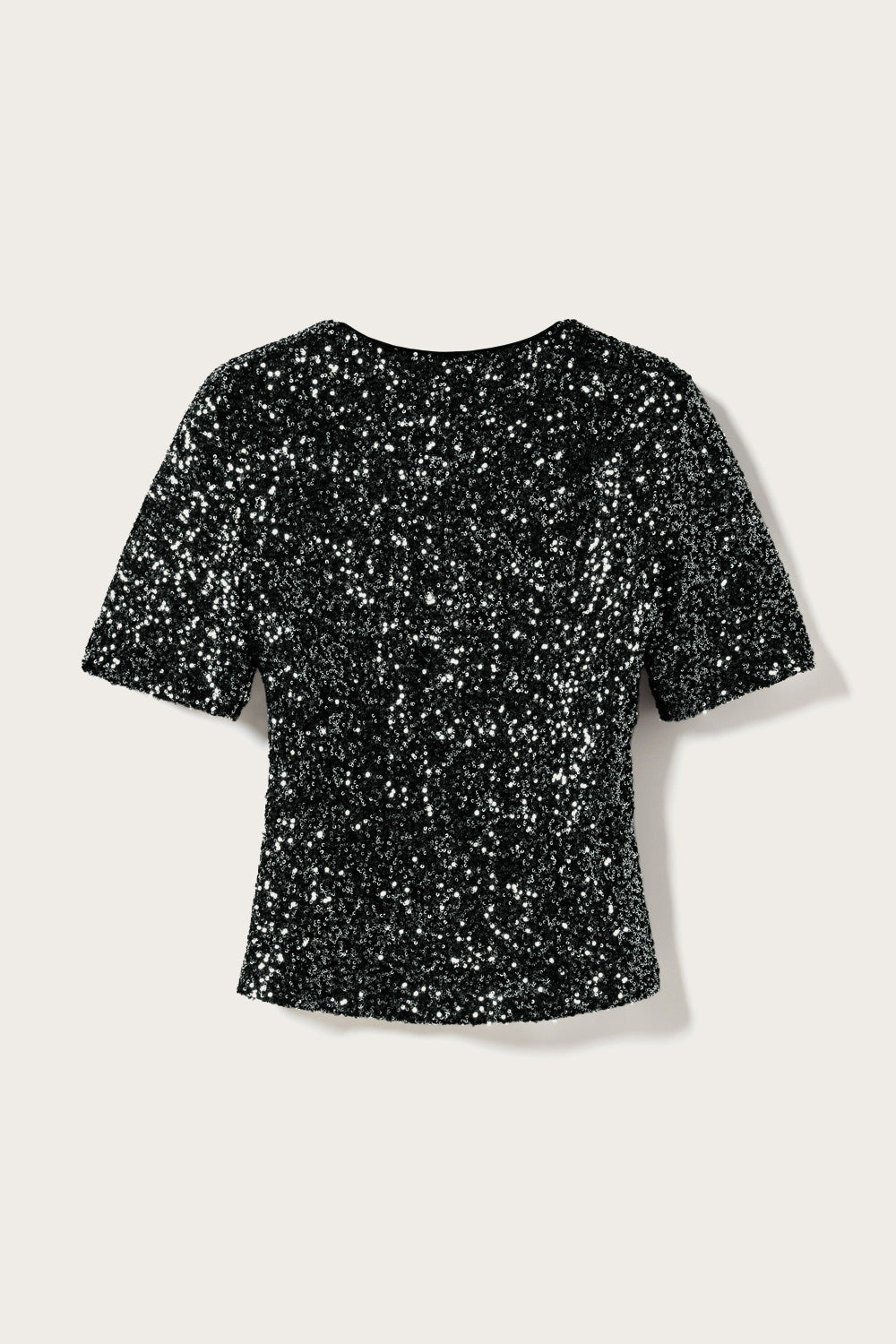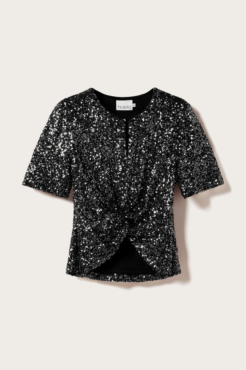 Lemon Blouse ist ein gedrehtes T-Shirt mit Pailletten und Schlitz vorne in der Mitte. Ideal für festliche Anlässe, kombinierbar mit hochgeschnittenen Hosen oder Rock für einen Partylook.