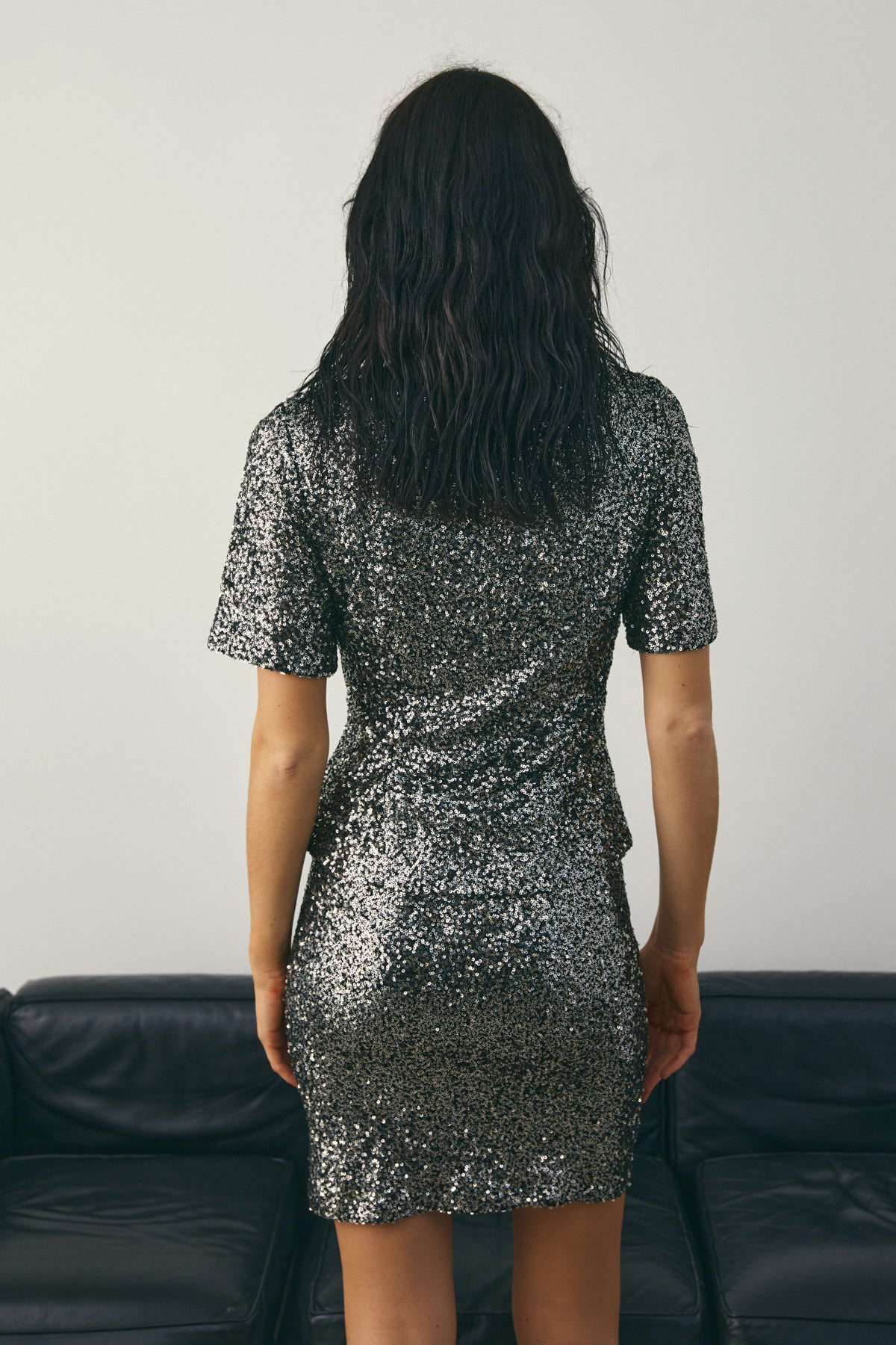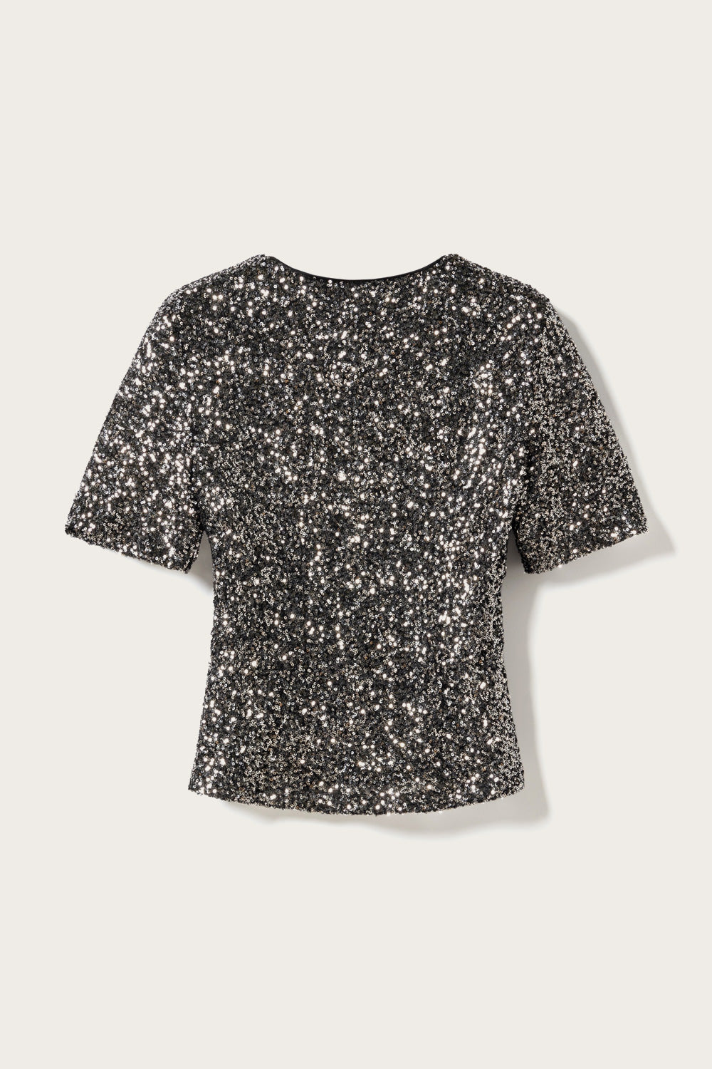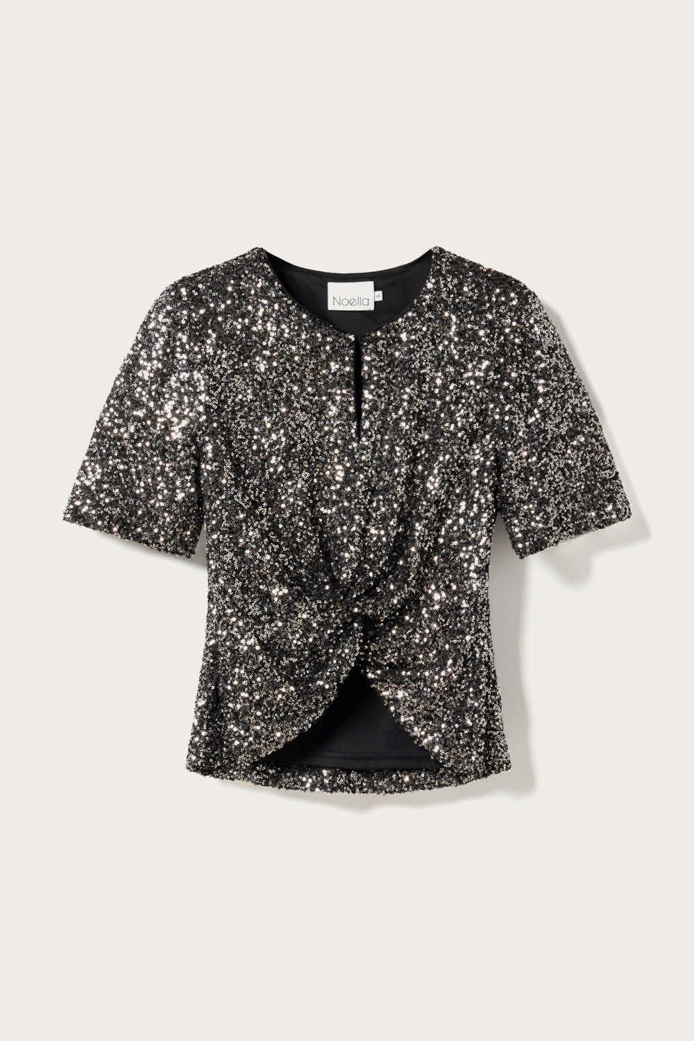 Lemon Blouse ist ein gedrehtes T-Shirt mit Pailletten und Schlitz vorne in der Mitte. Ideal für festliche Anlässe, kombinierbar mit hochgeschnittenen Hosen oder Rock für einen Partylook.