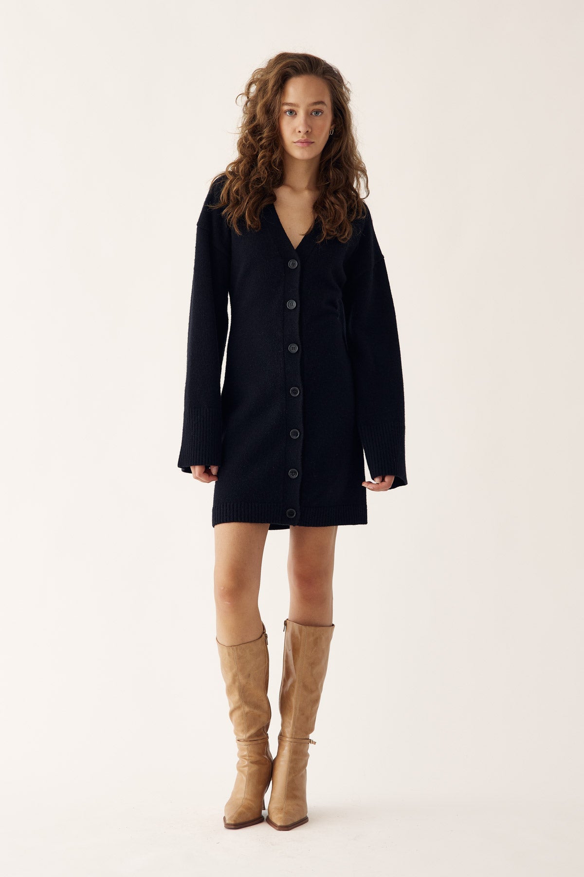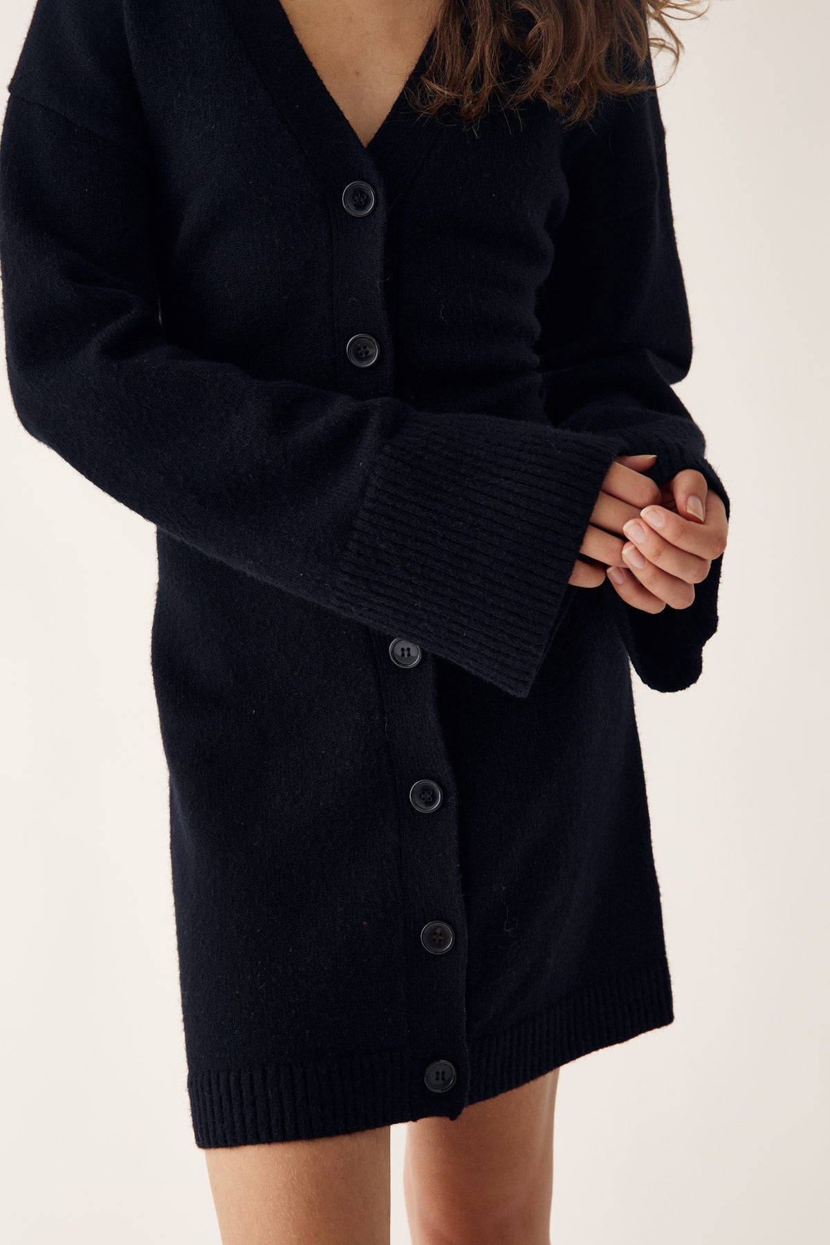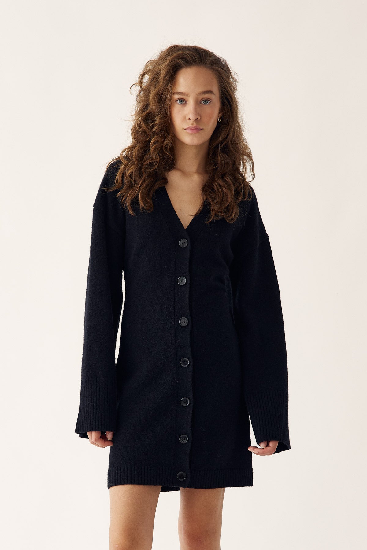 Lenyxanna Knit Dress ist ein Cardigan-Kleid mit figurbetonter Passform, langen voluminösen Ärmeln und Knopfleiste vorne.