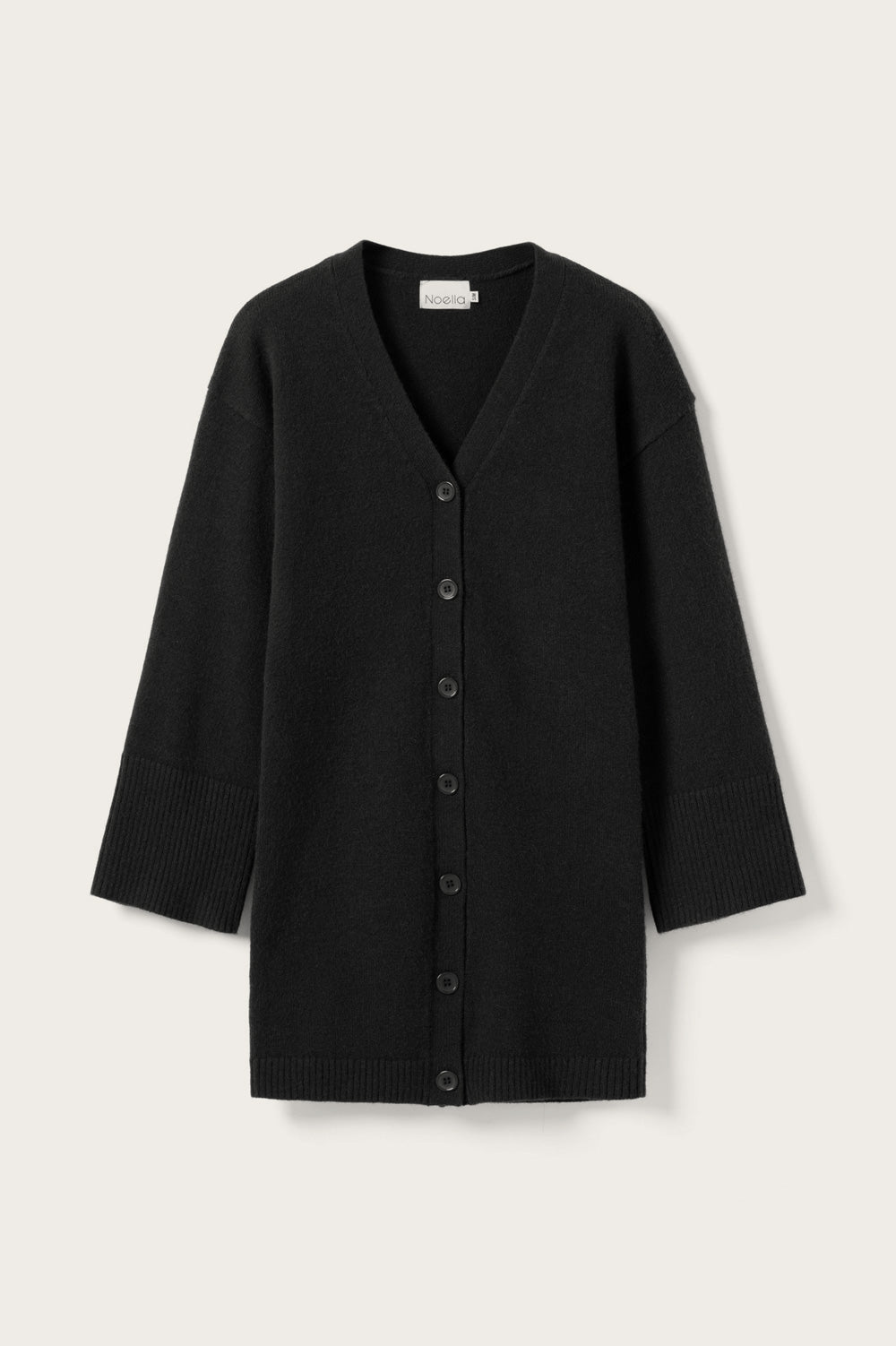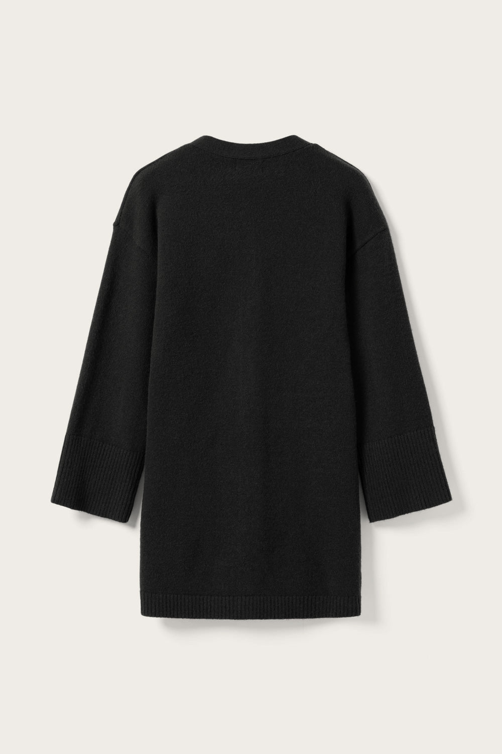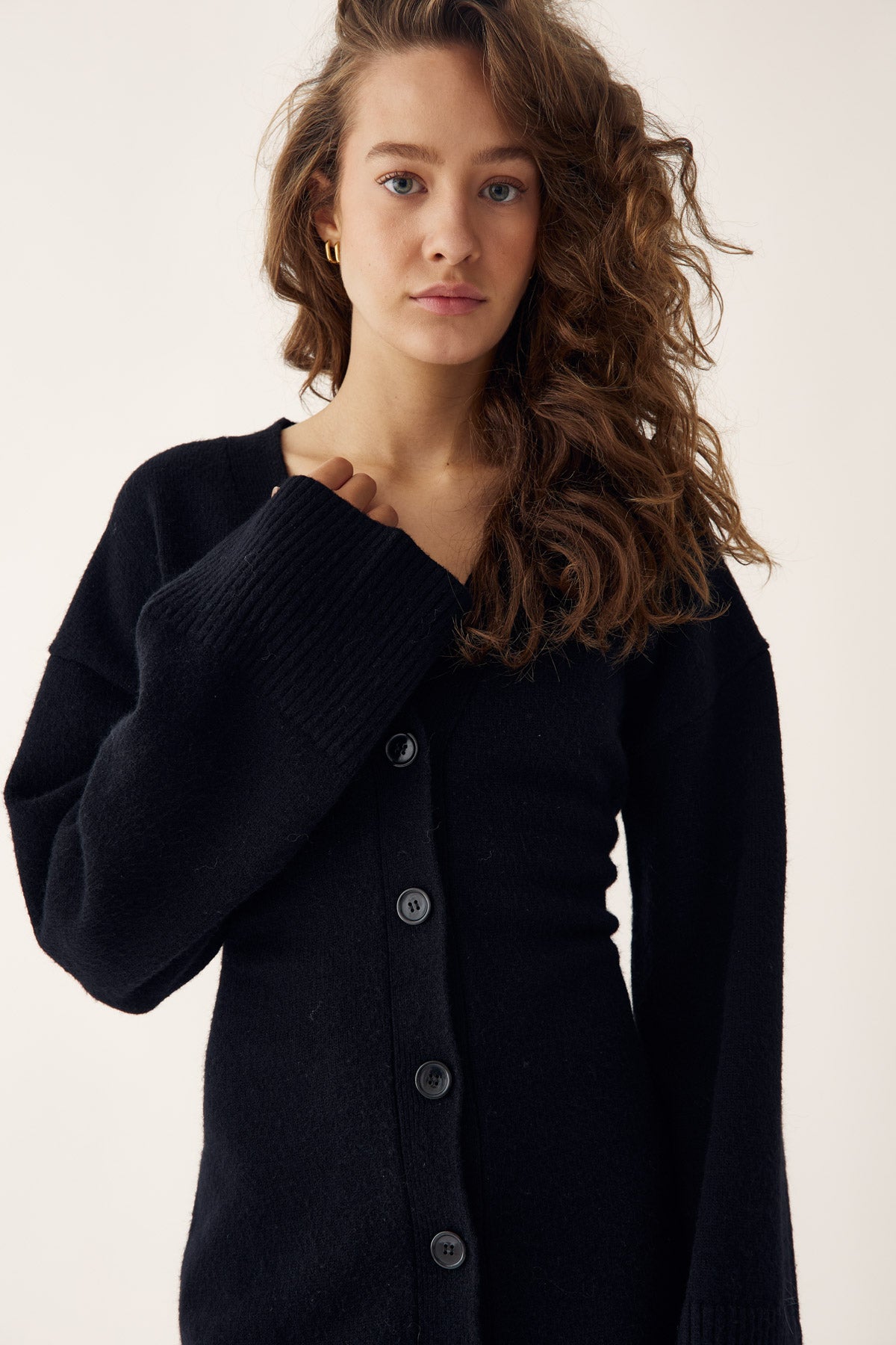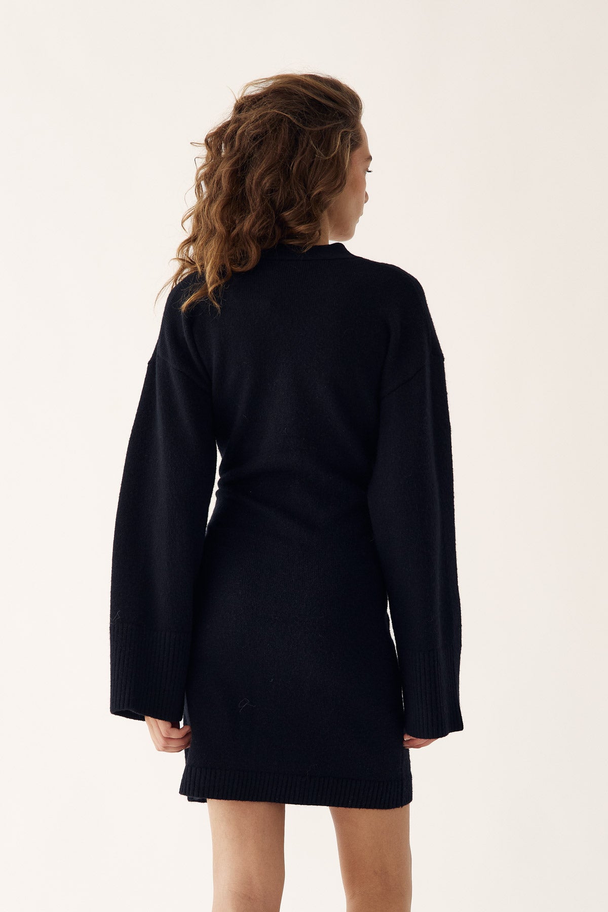 Lenyxanna Knit Dress ist ein Cardigan-Kleid mit figurbetonter Passform, langen voluminösen Ärmeln und Knopfleiste vorne.
