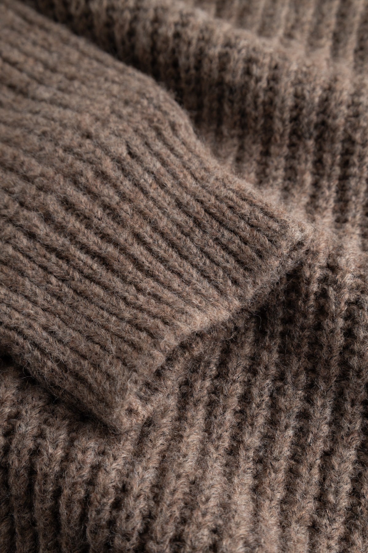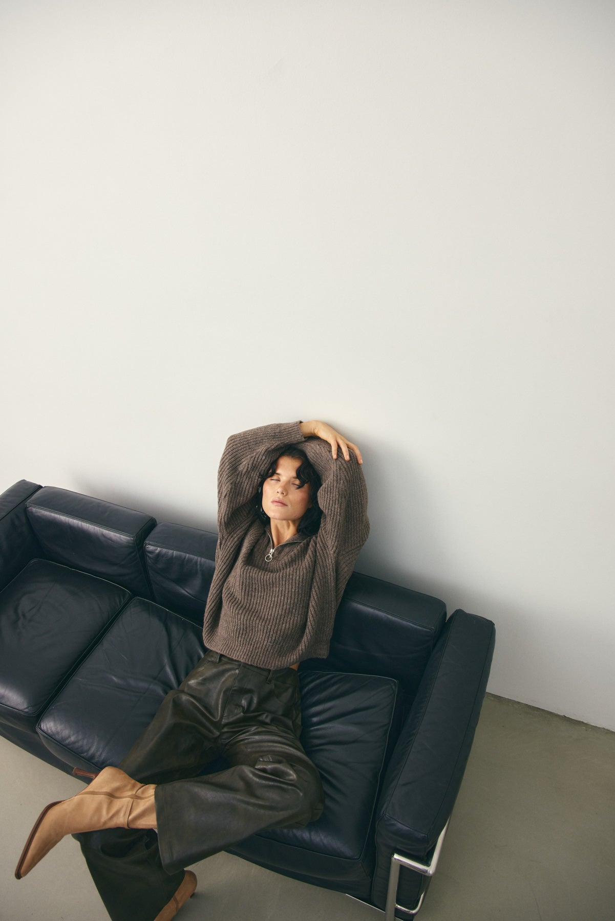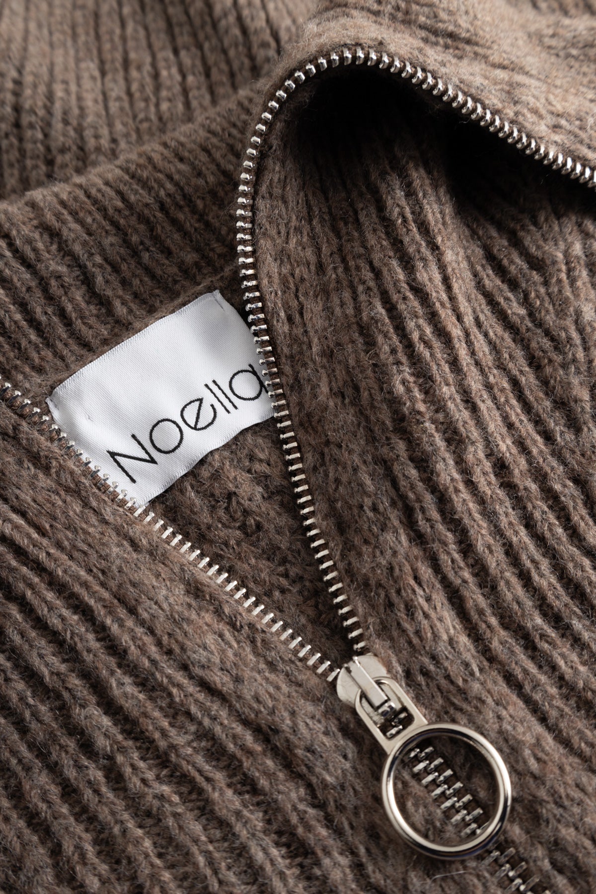 Lesia Knit ist ein Rippstrickpullover mit Reißverschluss, verstellbarem Kragen und lockerer Passform.