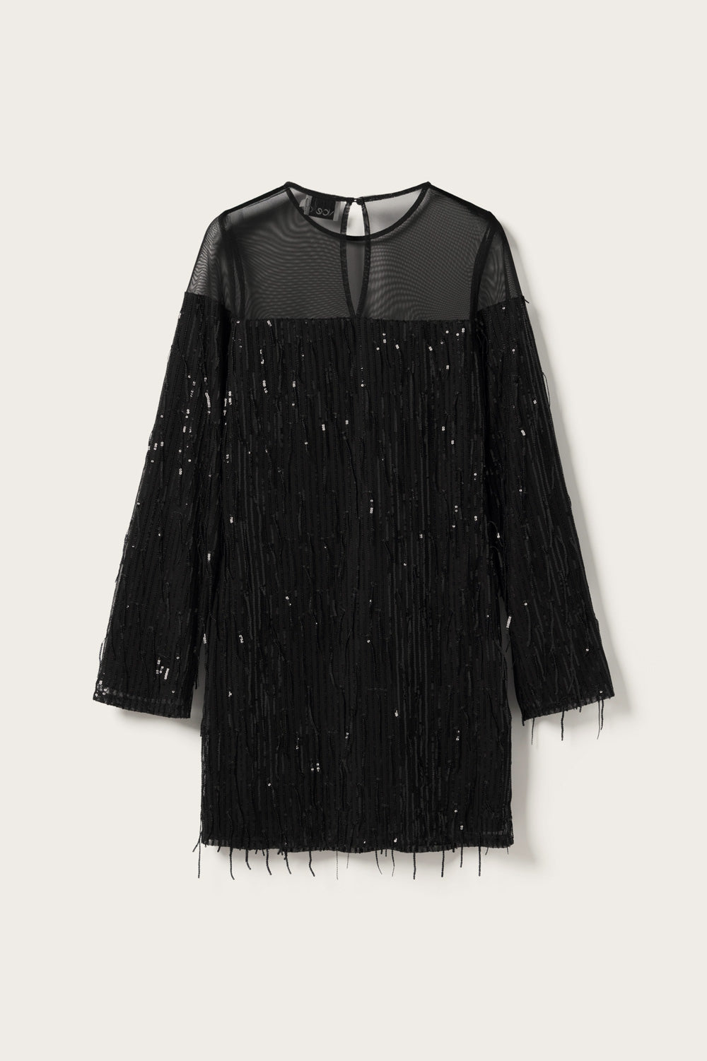 Leyah Dress ist ein kurzes Kleid mit funkelnden Pailletten und Mesh-Detail am Passe. Ideal für festliche Anlässe und kombinierbar mit High Heels für einen eleganten Party-Look oder mit Stiefeln für einen coolen, lässigen Stil.
