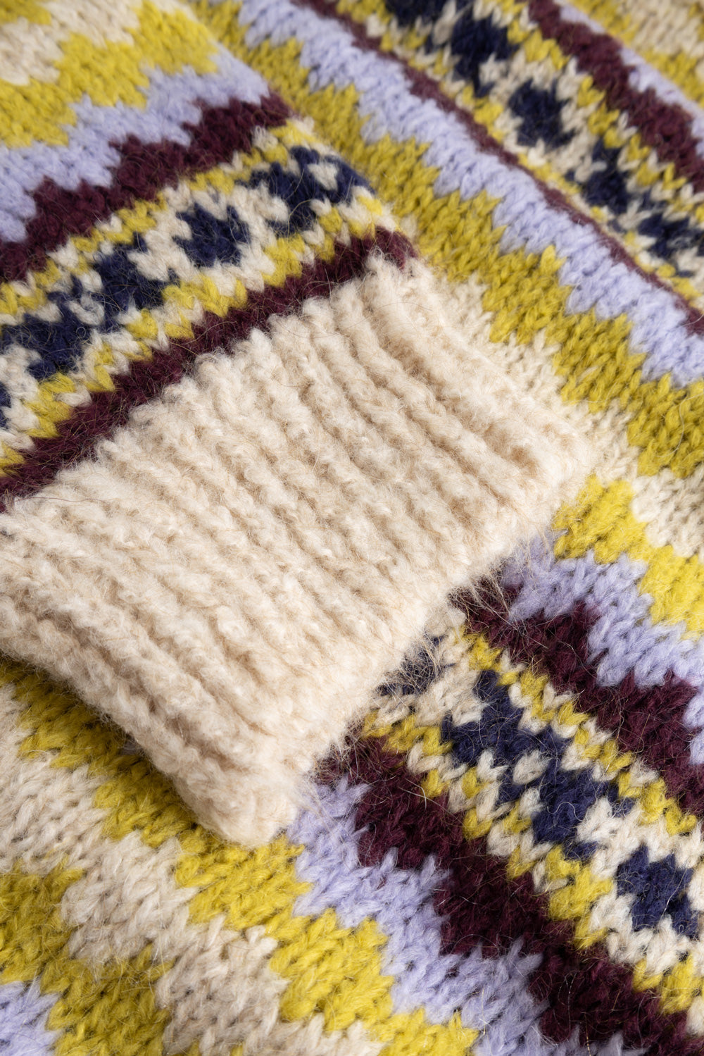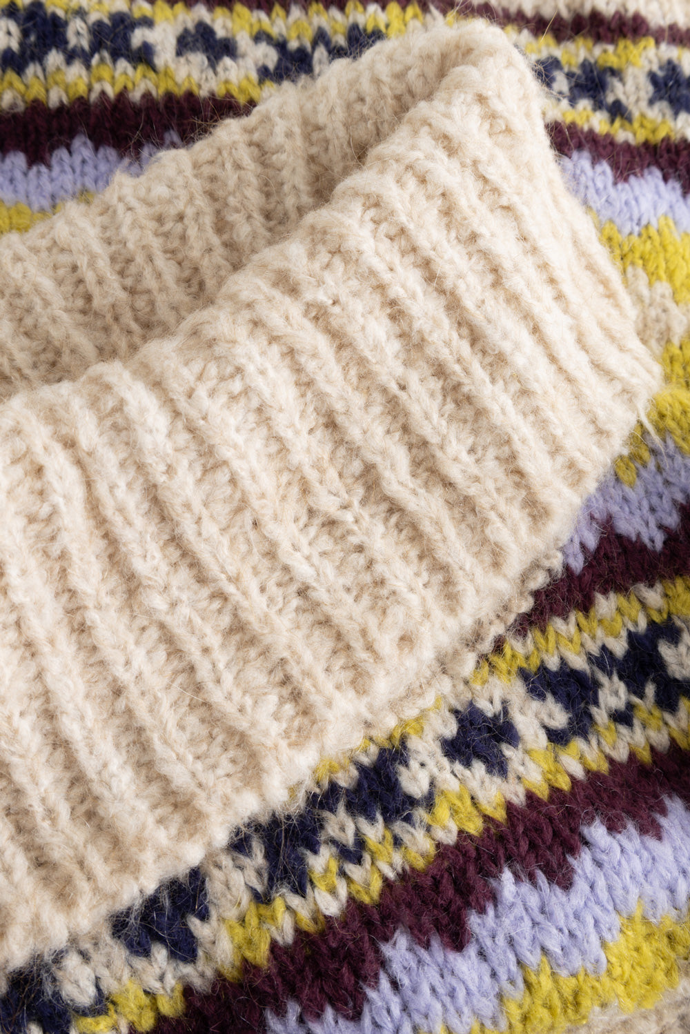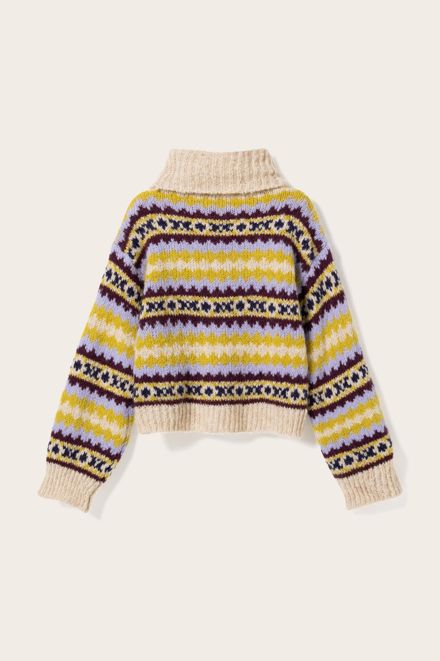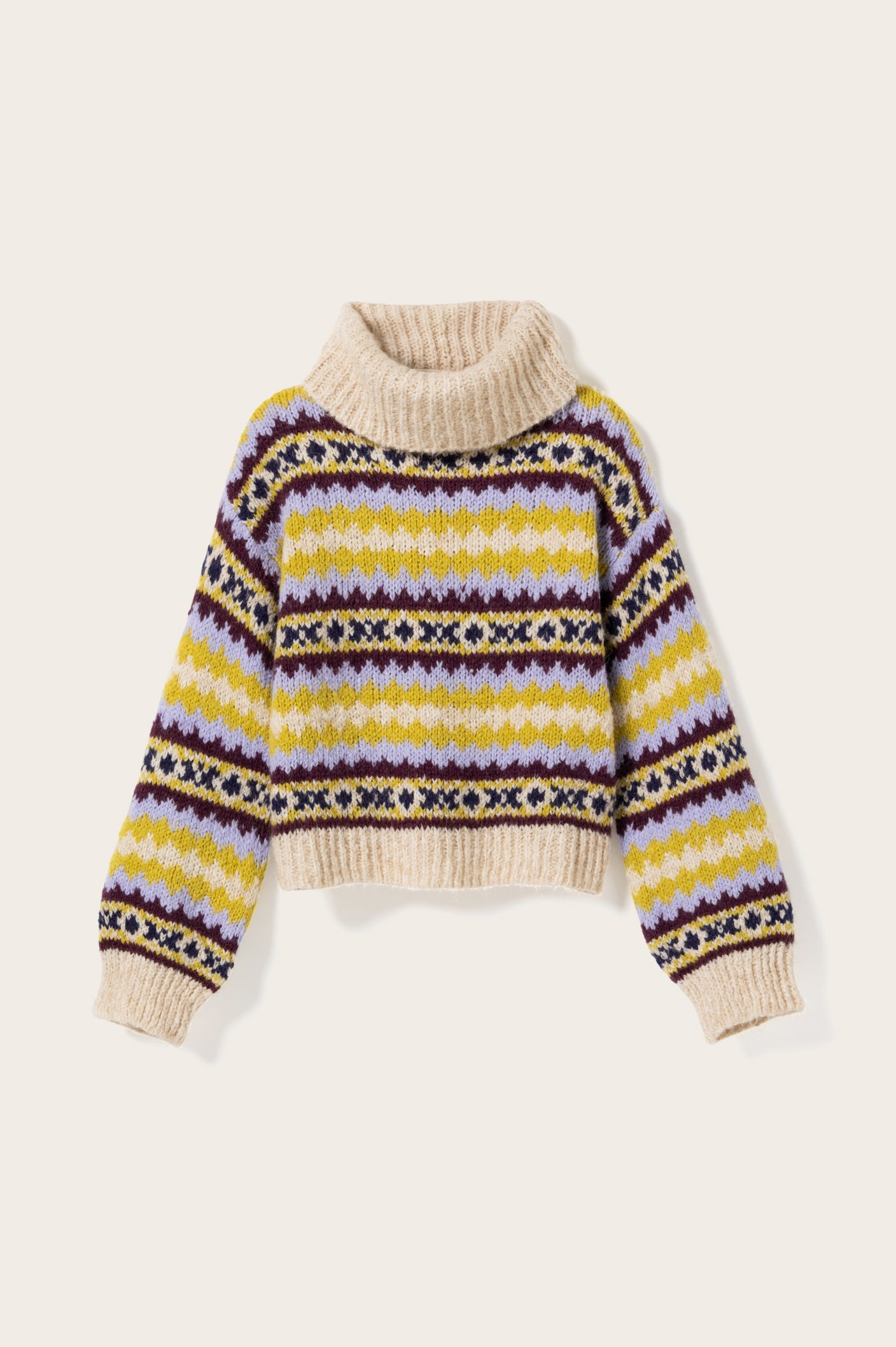 Lidija Knit ist ein Strickpullover im Loose Fit mit hohem Rollkragen, Rippkanten und mehrfarbigem Muster.