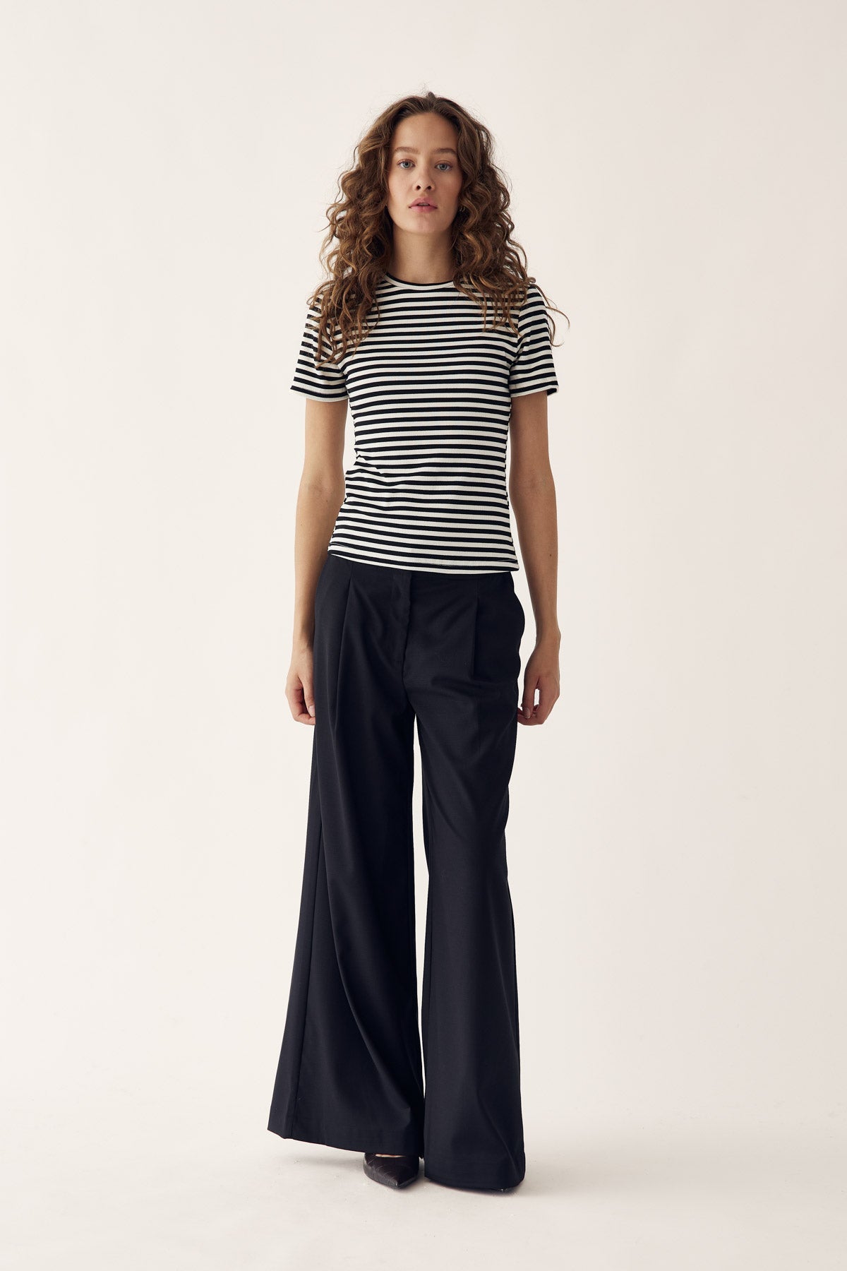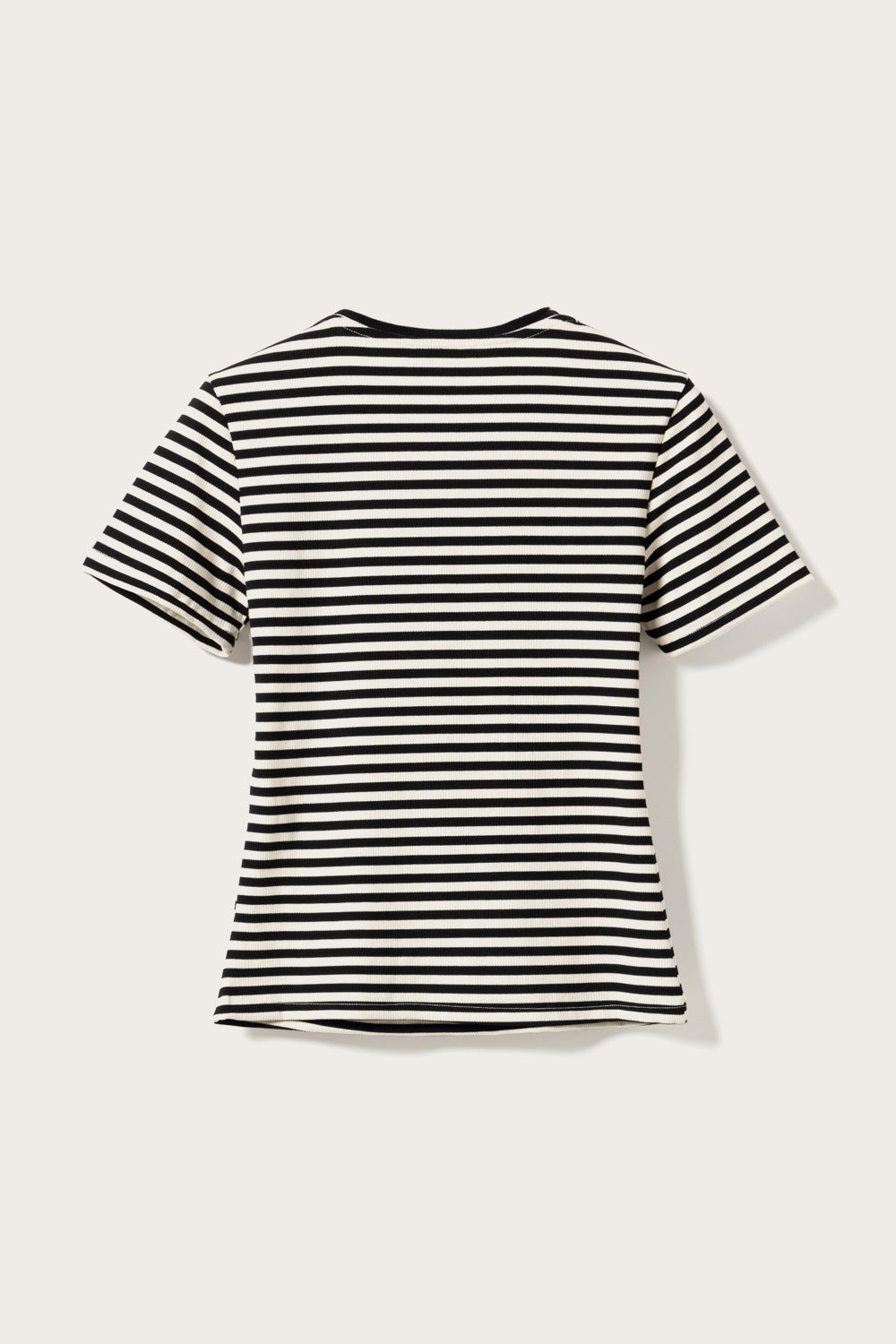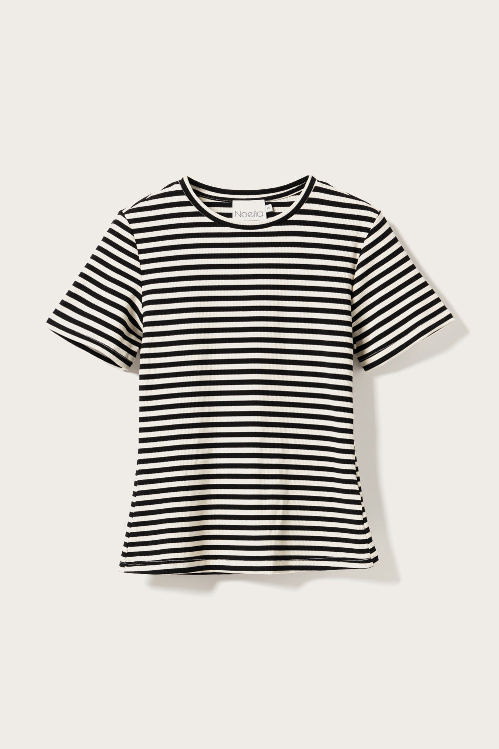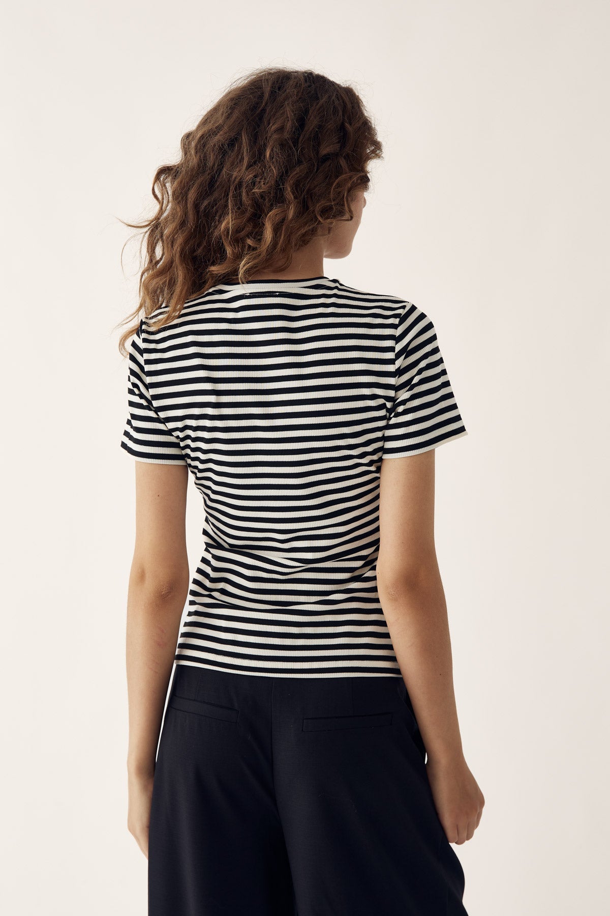Lizzy Top ist ein kurzärmeliges T-Shirt mit Streifenmuster und Rundhalsausschnitt. Das Top hat eine reguläre Passform, die einen entspannten und schlichten Look schafft. Verwenden Sie es als Teil Ihrer Basisgarderobe.