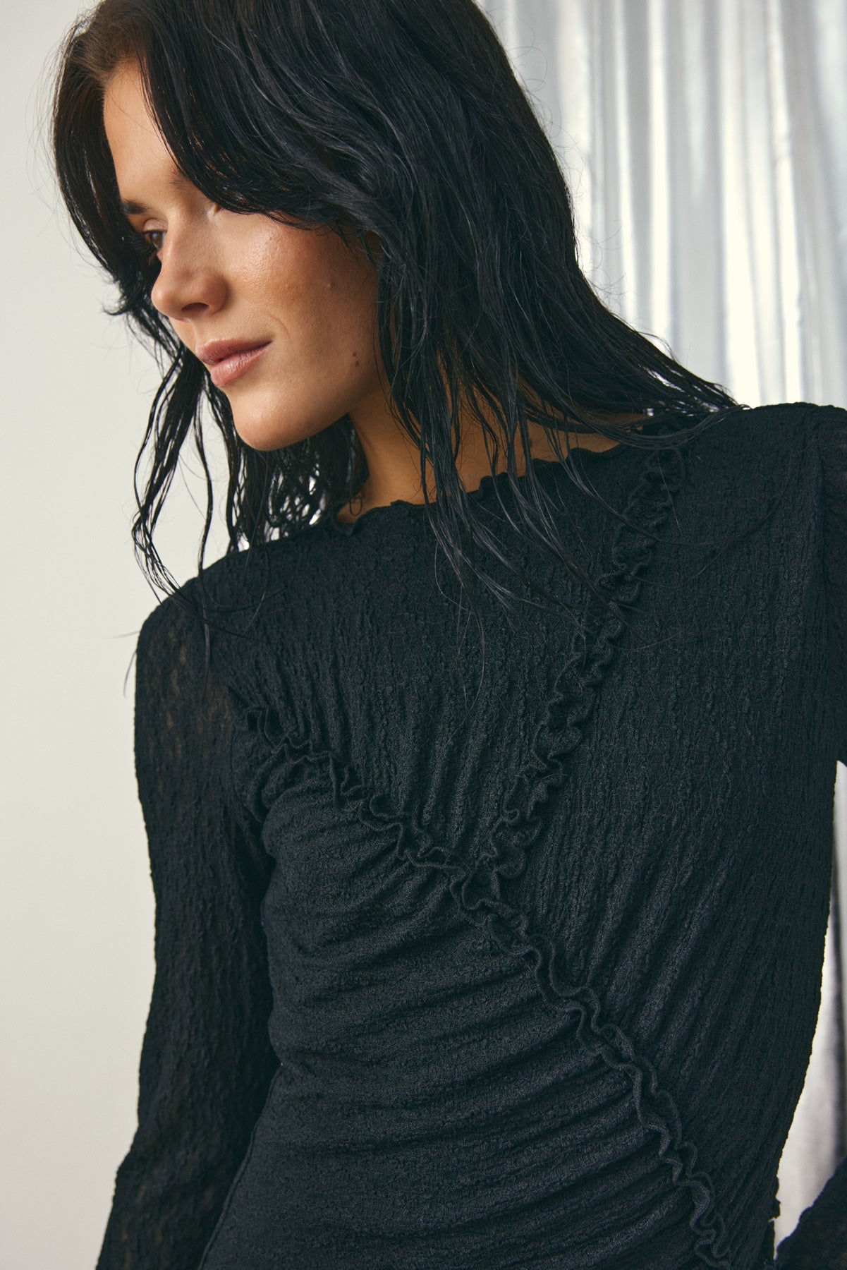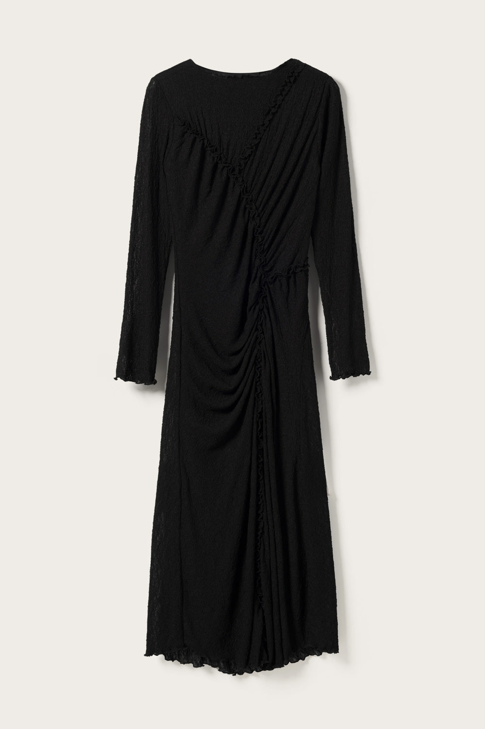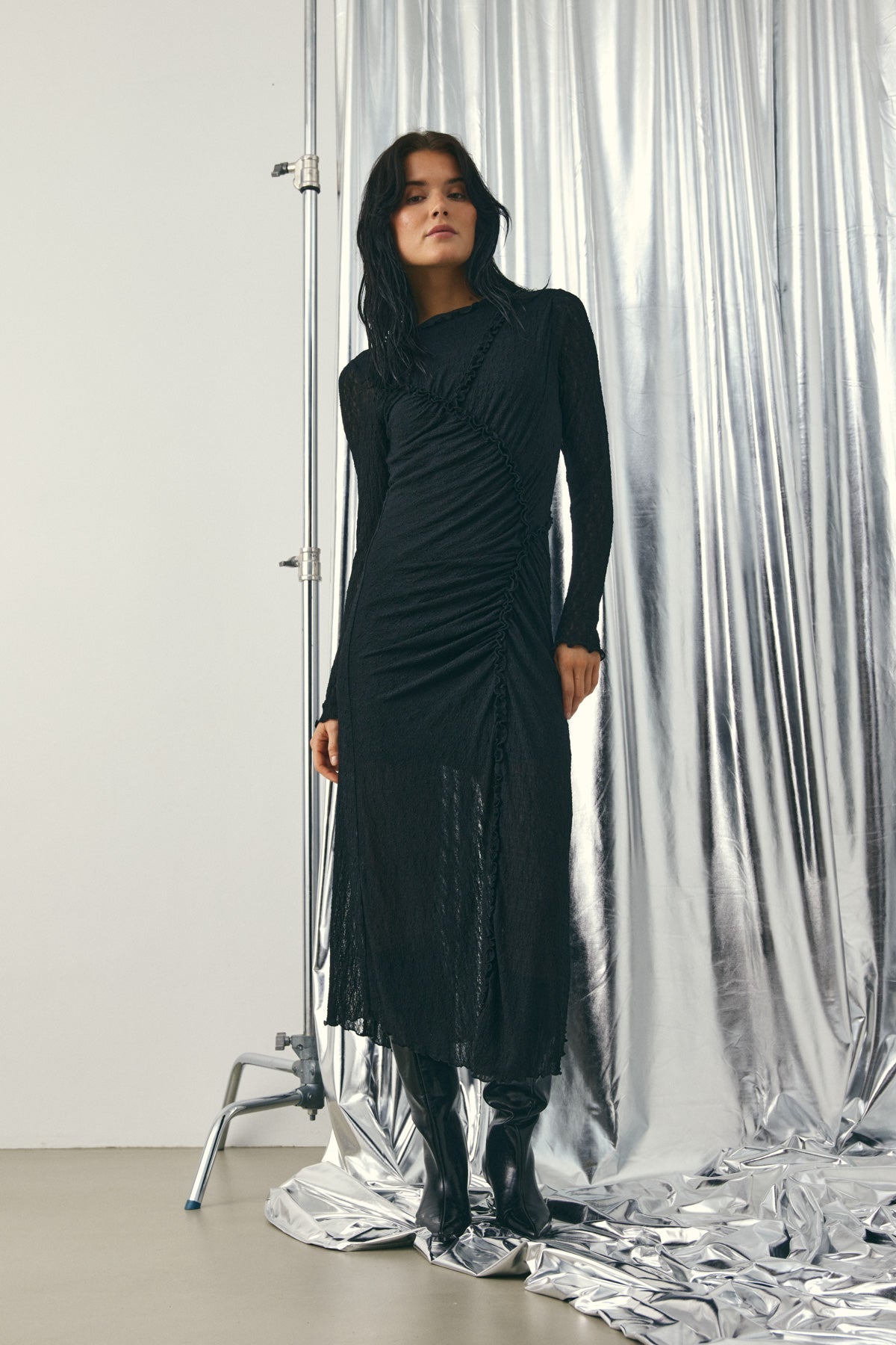 Loma Dress ist ein langes Kleid mit markanter Schnittlinie und Raffung vorne, die die Silhouette betont. Perfekt als kleines Kleid für festliche Anlässe.