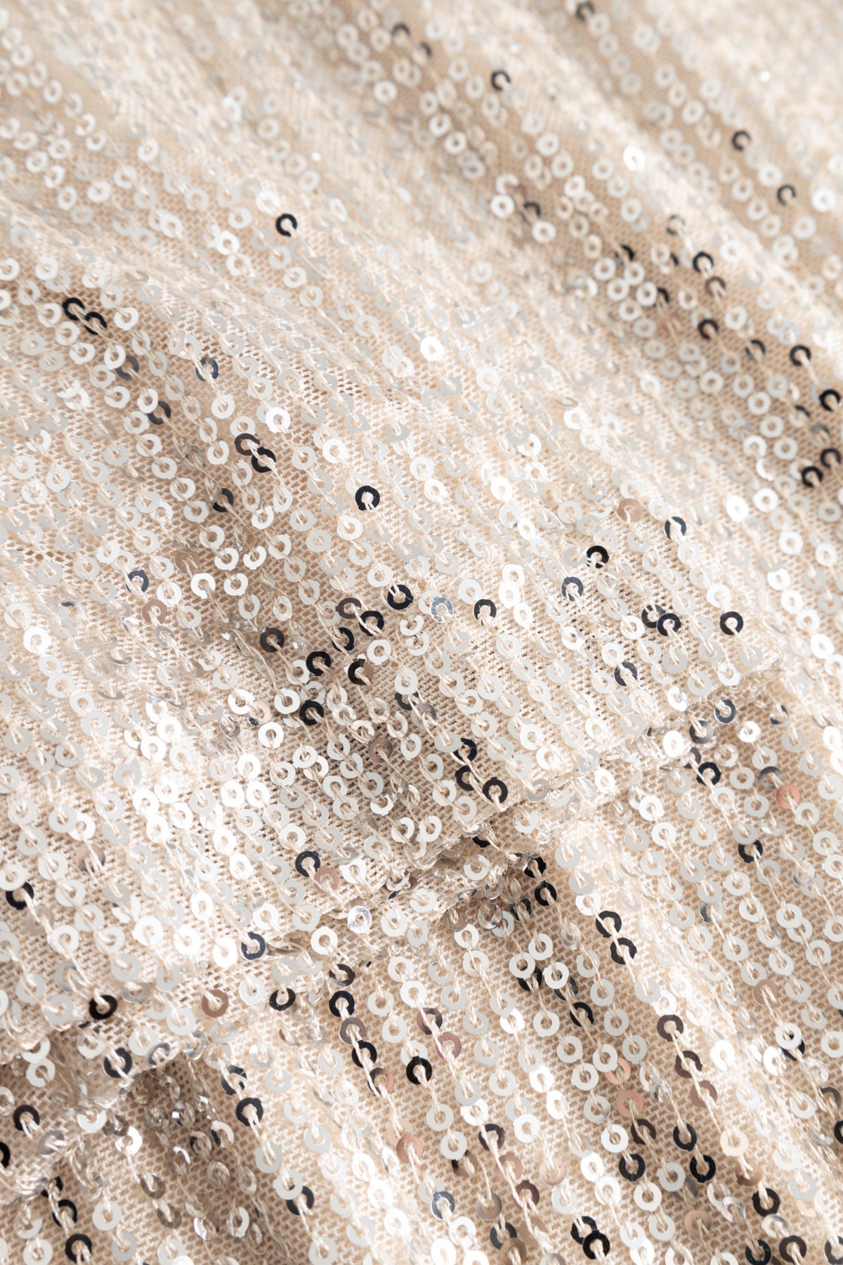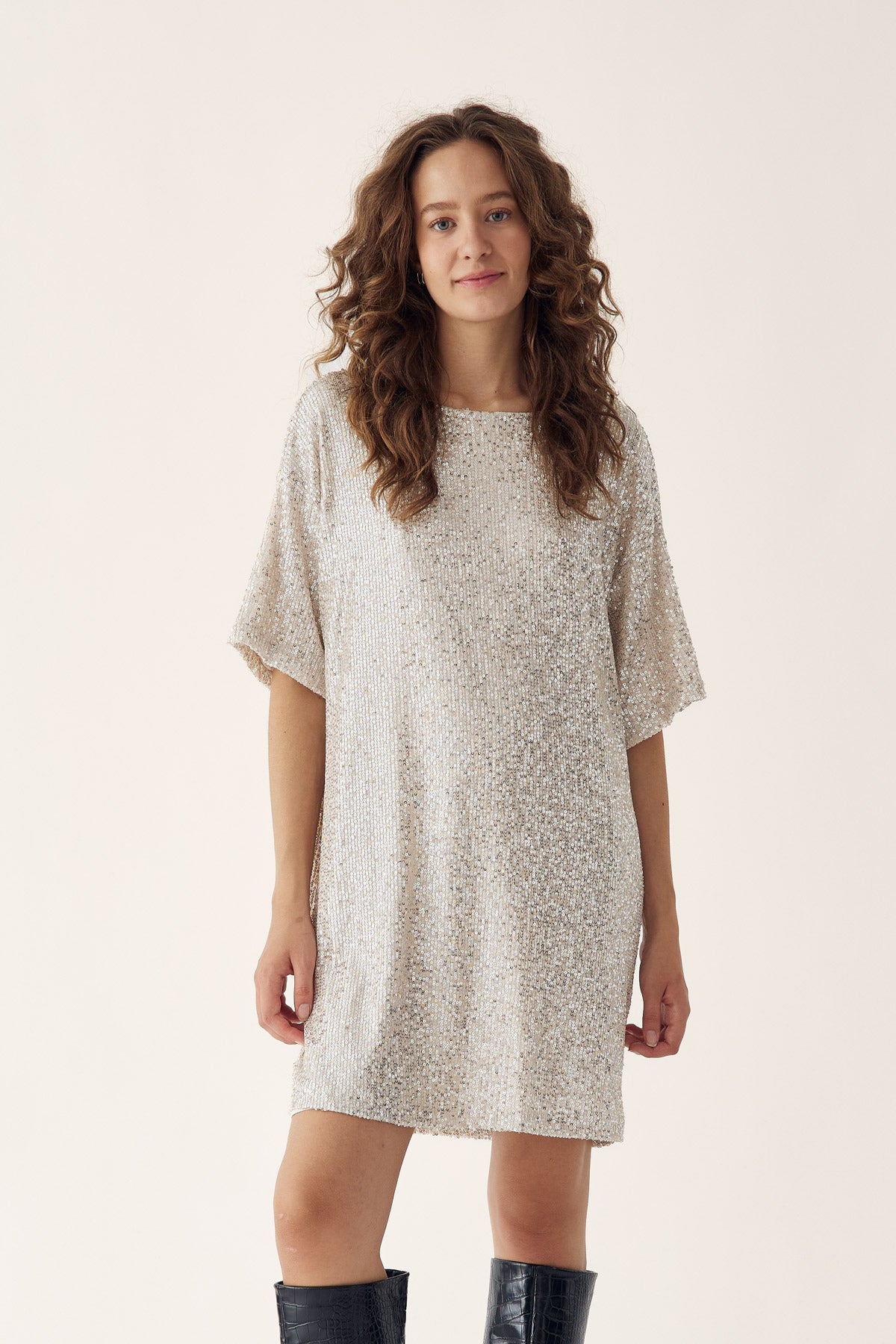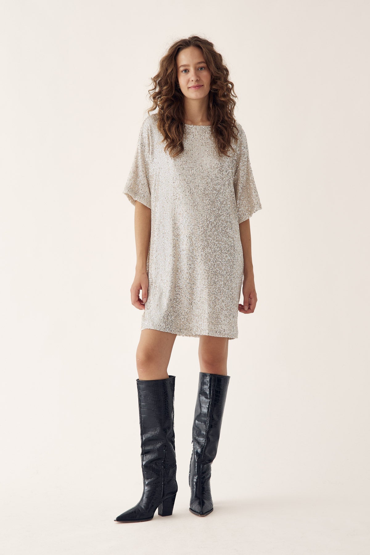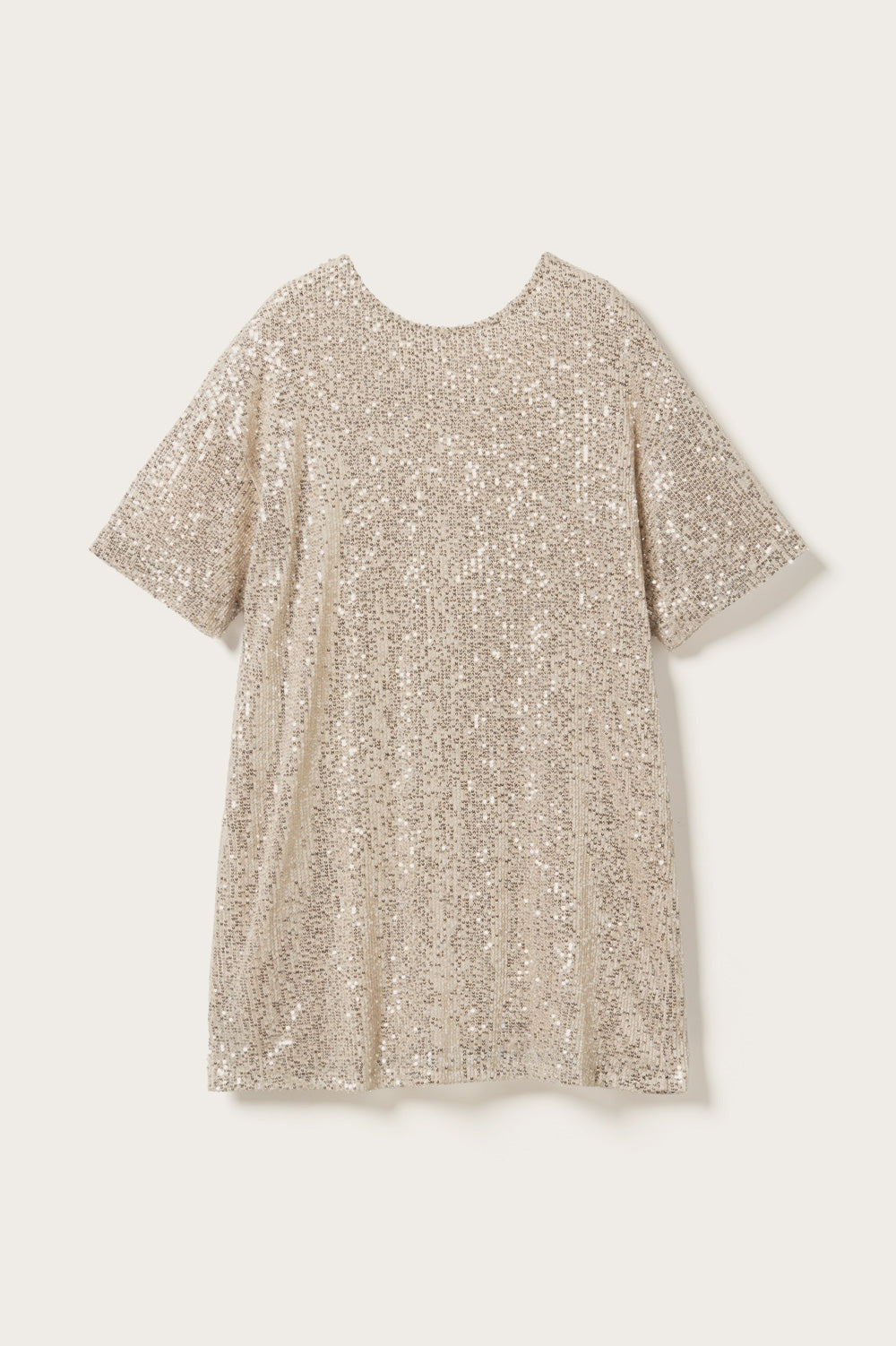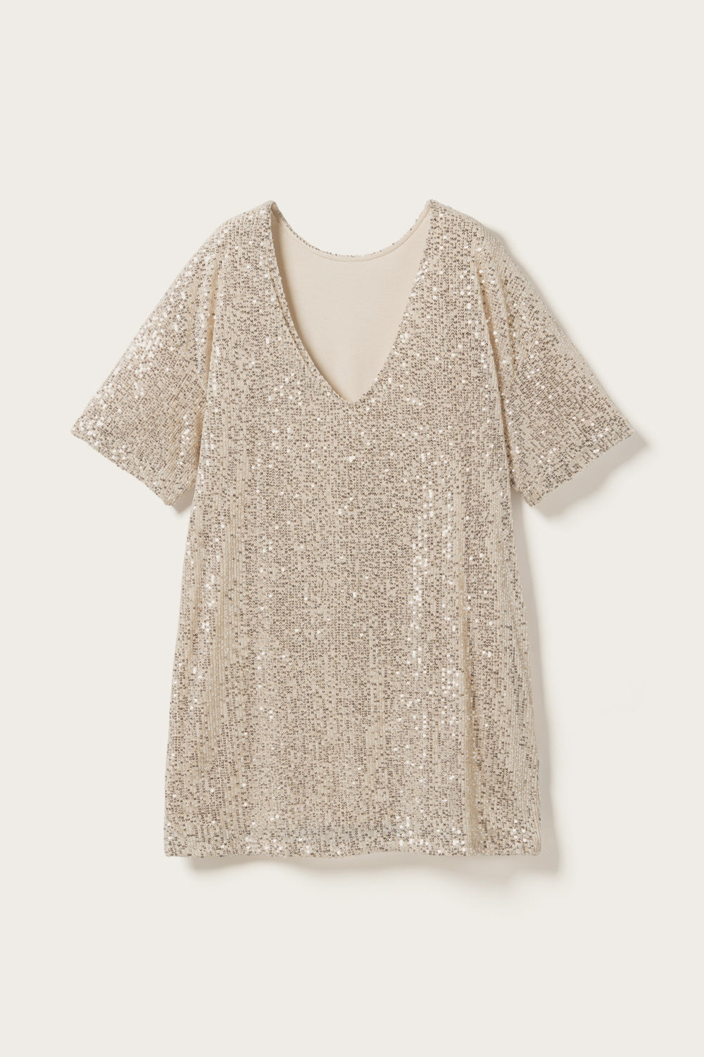 Lorah Dress ist ein Kleid im T-Shirt-Design mit lockerer Passform, kurzen Ärmeln, Pailletten und V-Ausschnitt am Rücken.