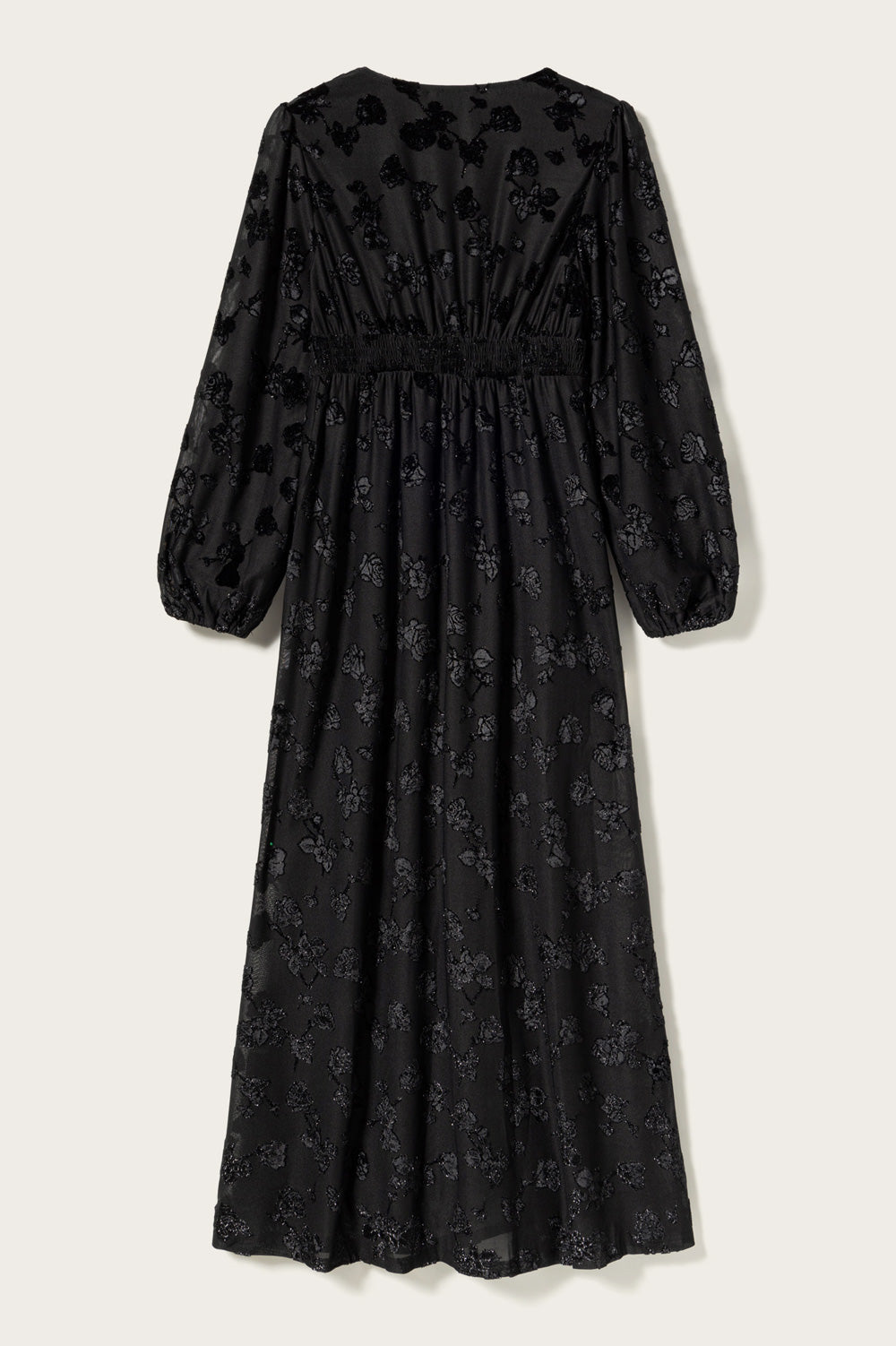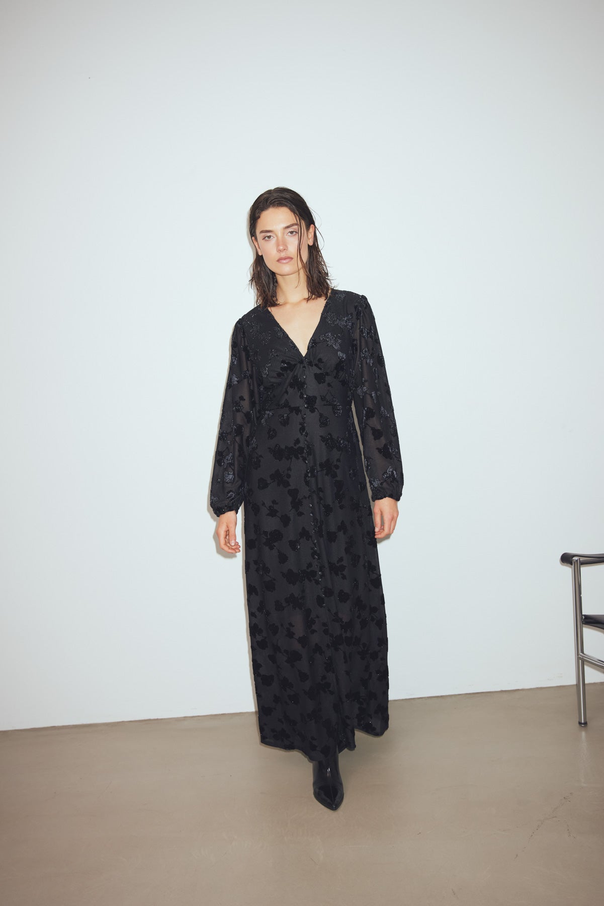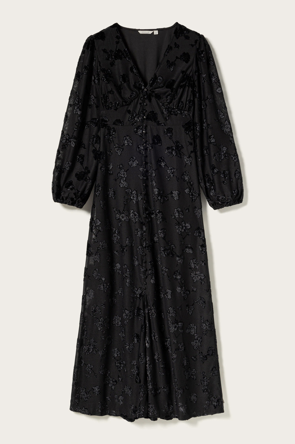 Das N-Lilith Maxi Dress ist ein Maxikleid mit langen Ärmeln, einem seitlichen Schlitz, V-Ausschnitt und schimmernden Blumen im Stoff. Das N-Lilith Dress hat eine lockere Passform mit einer betonten Taille, was einen luftigen und femininen Look verleiht und es einfach macht, es zu jedem Anlass zu stylen.