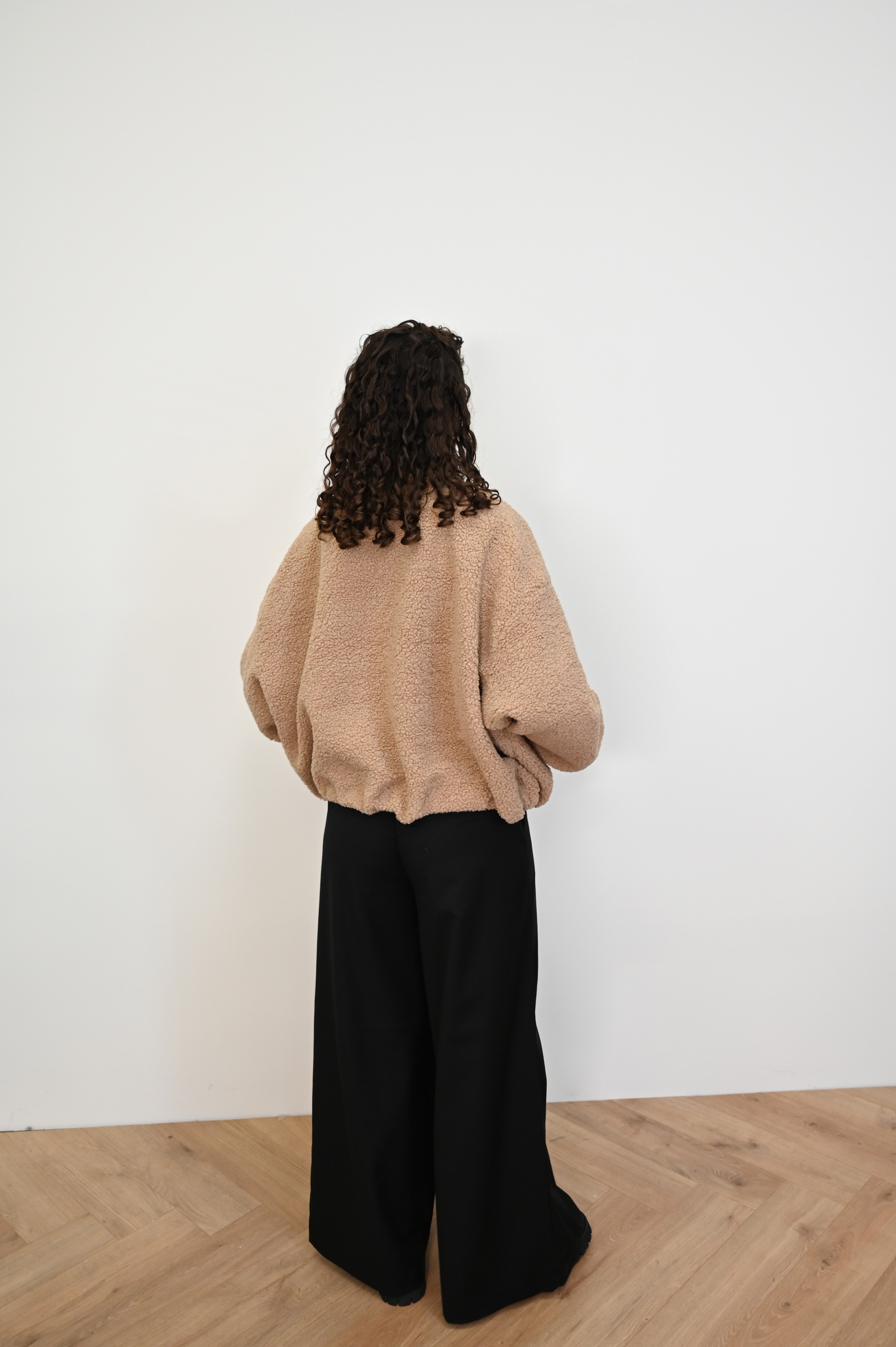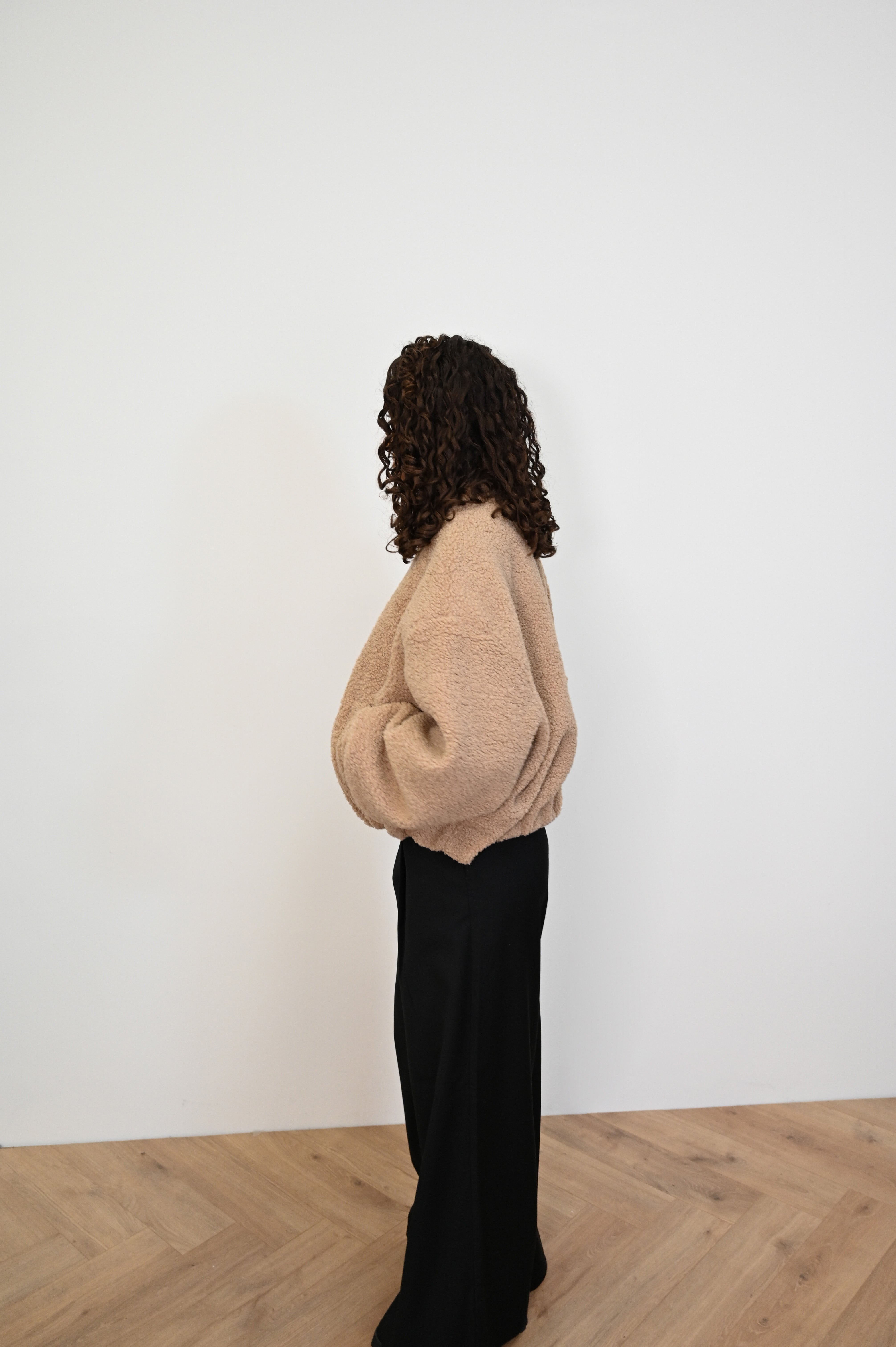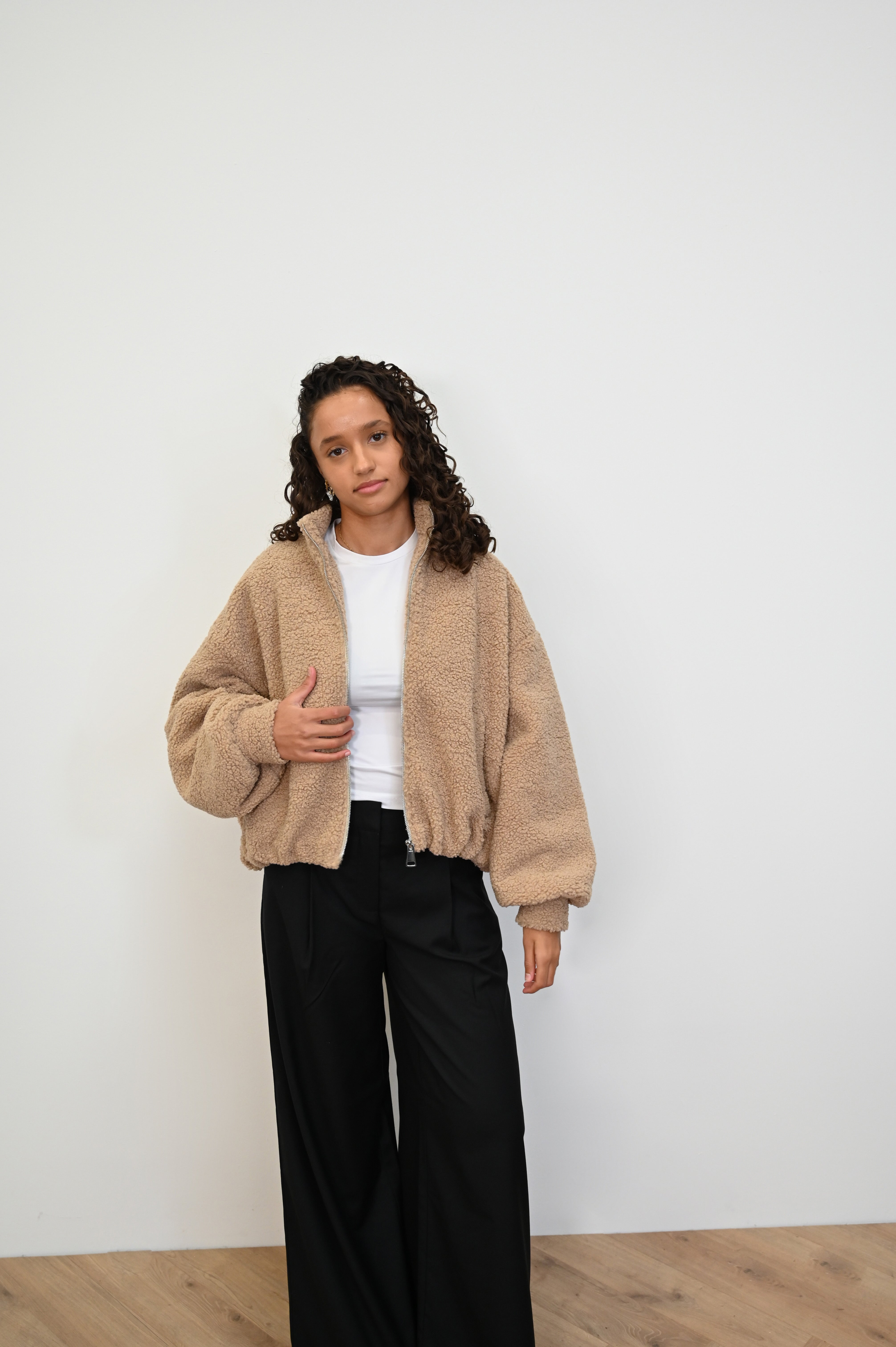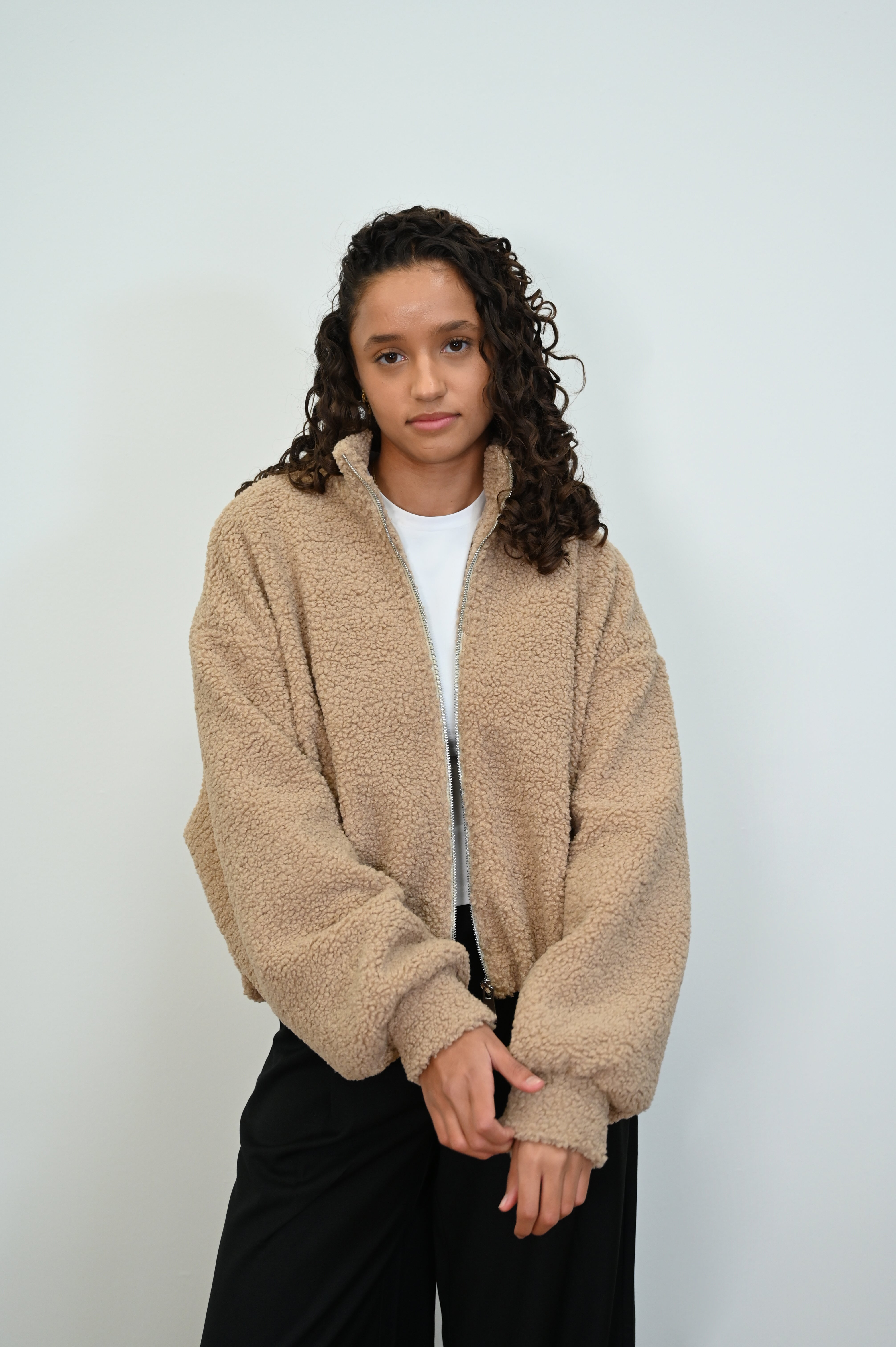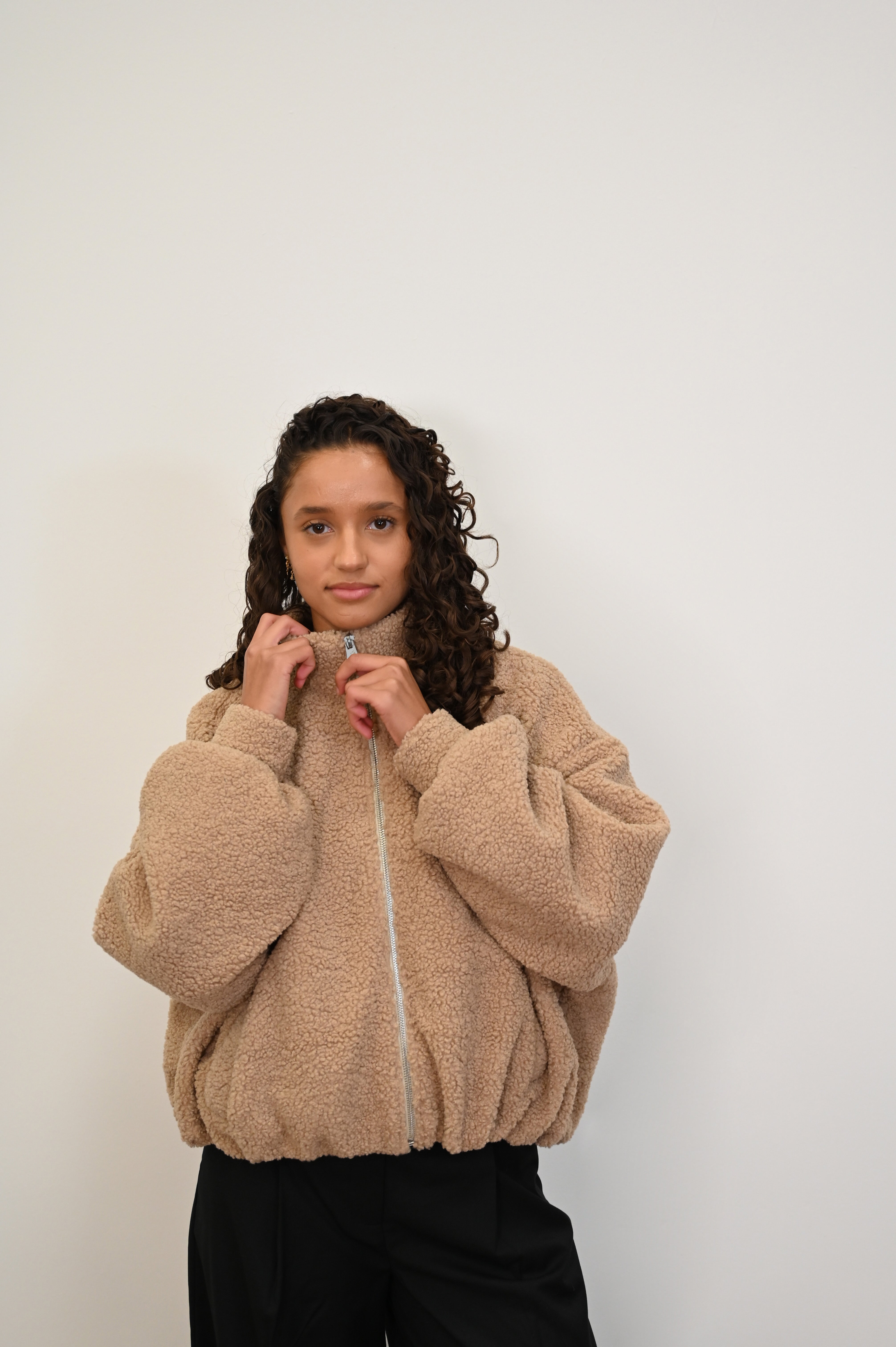 N-Mable Jacket is designed in a soft teddy fabric, featuring a high neck and front zipper closure. The elasticated bottom hem ensures a comfortable fit, while practical side pockets add functionality.