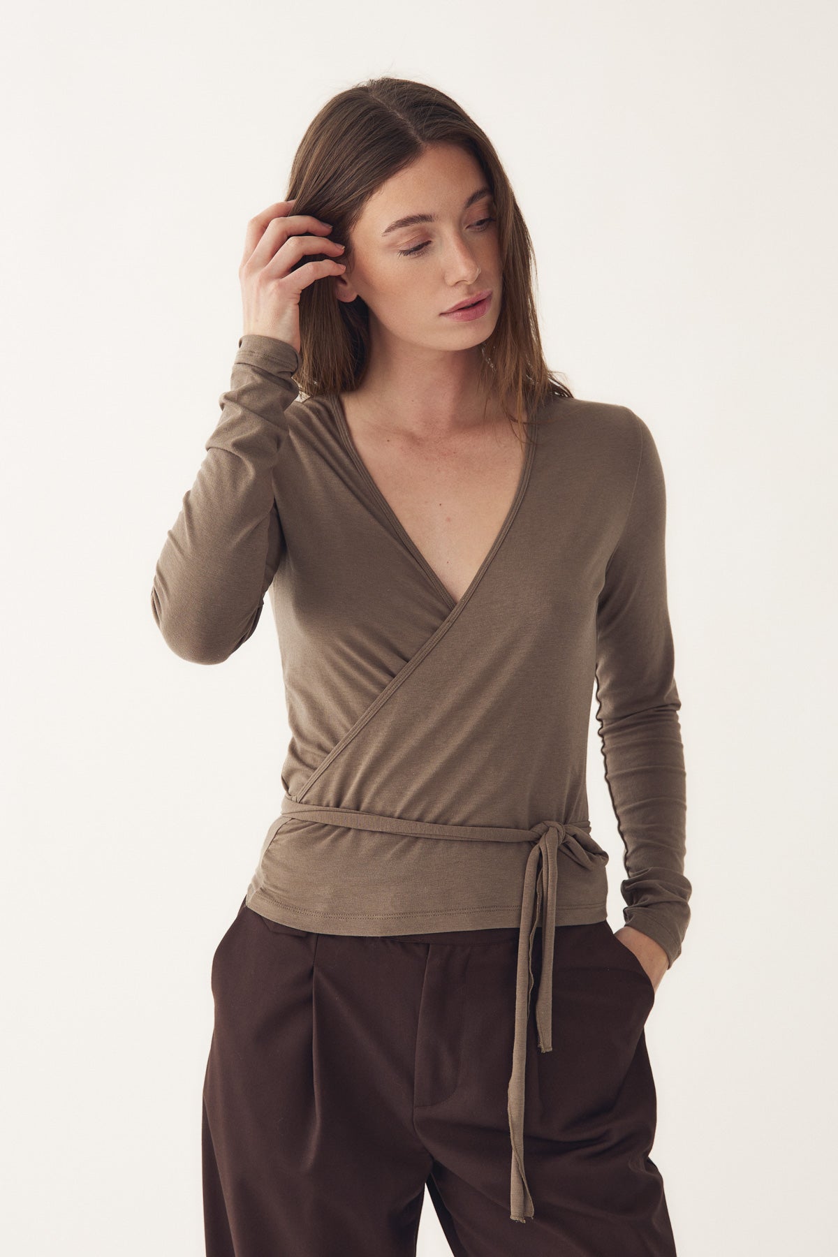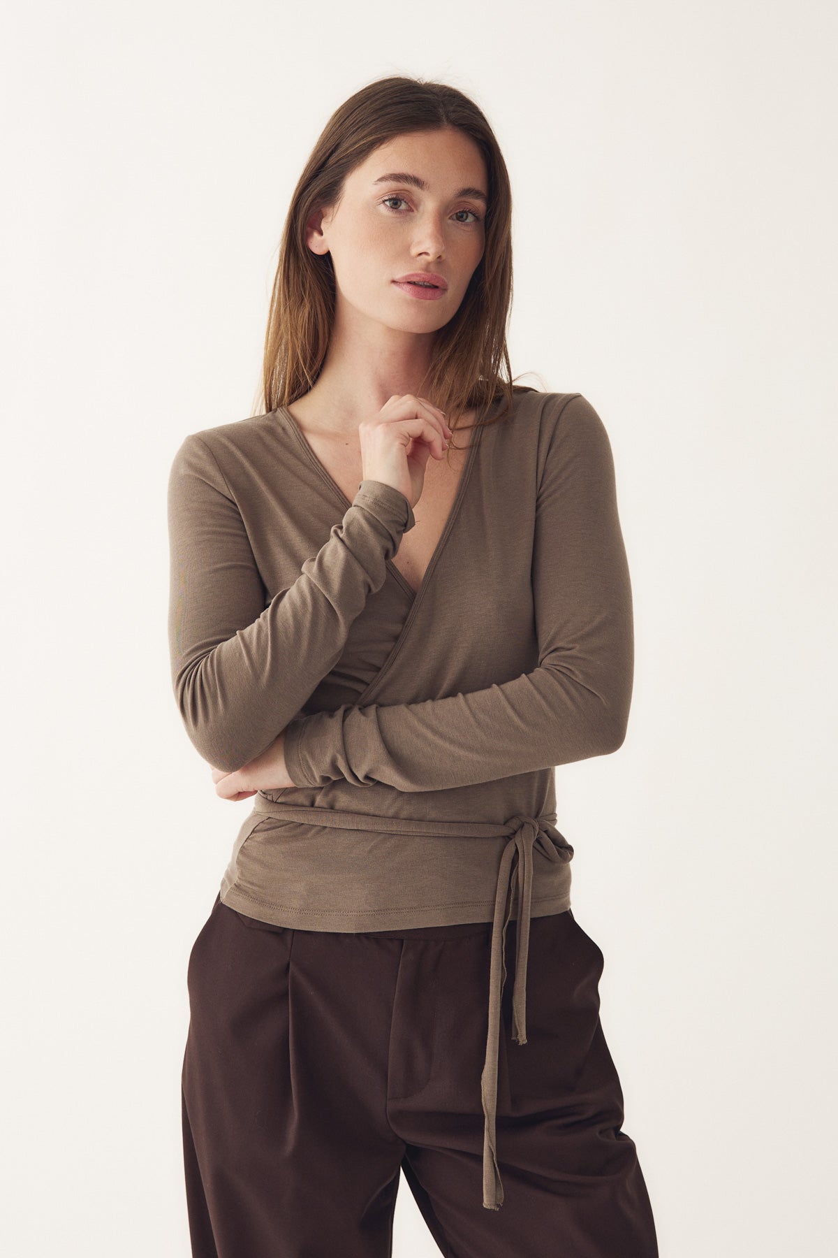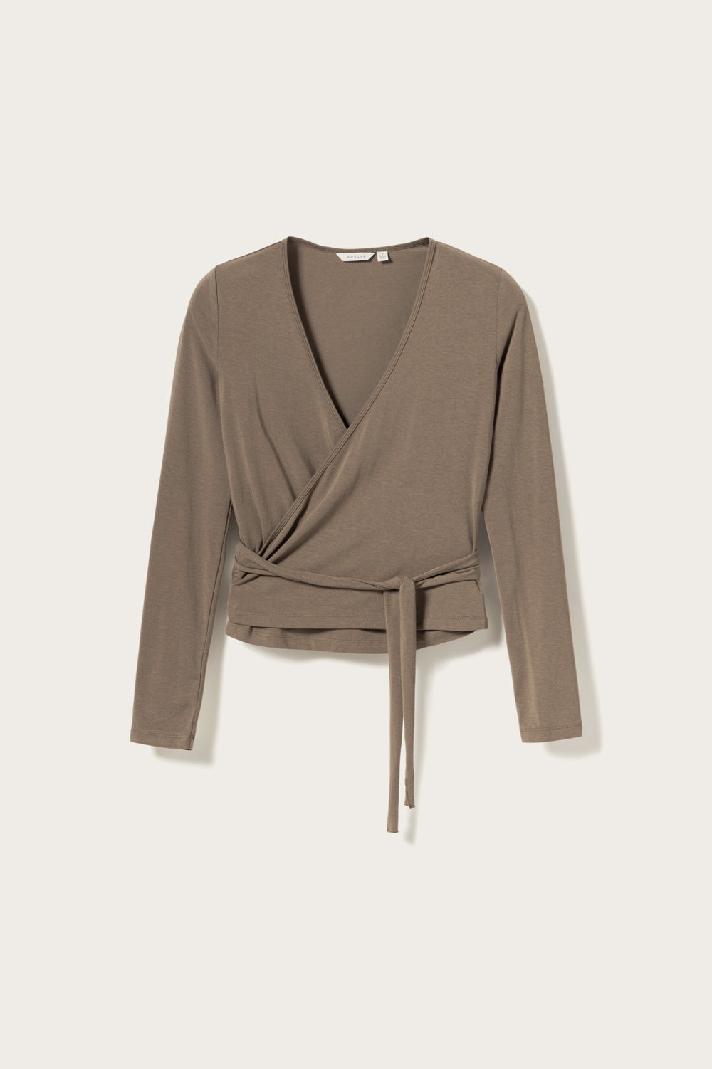 Das N-Maddie Top ist aus einer Viskosemischung gefertigt und verfügt über lange Ärmel sowie eine schmeichelhafte Wickeloptik vorne, die die Taille betont und eine elegante Silhouette formt.