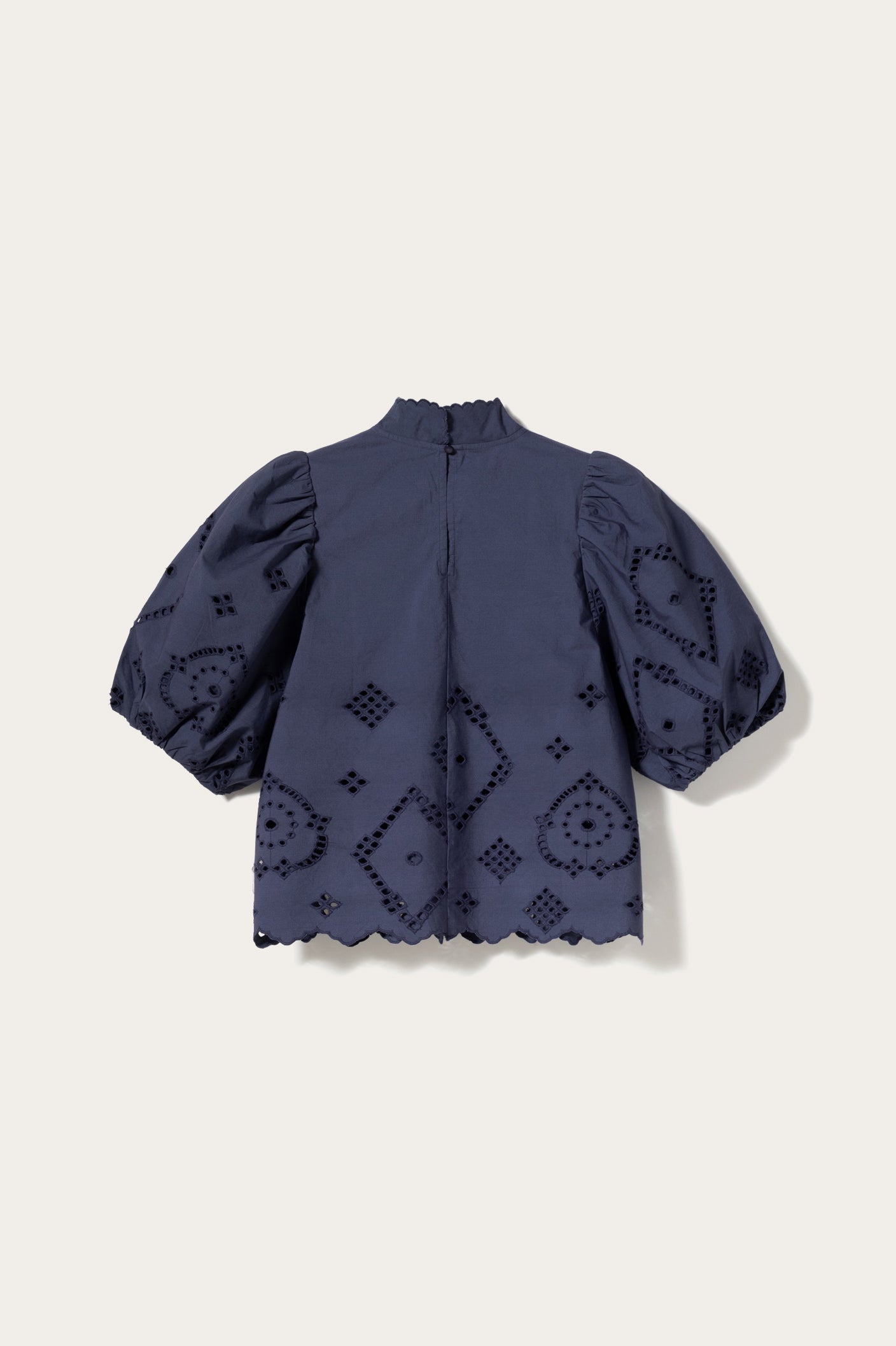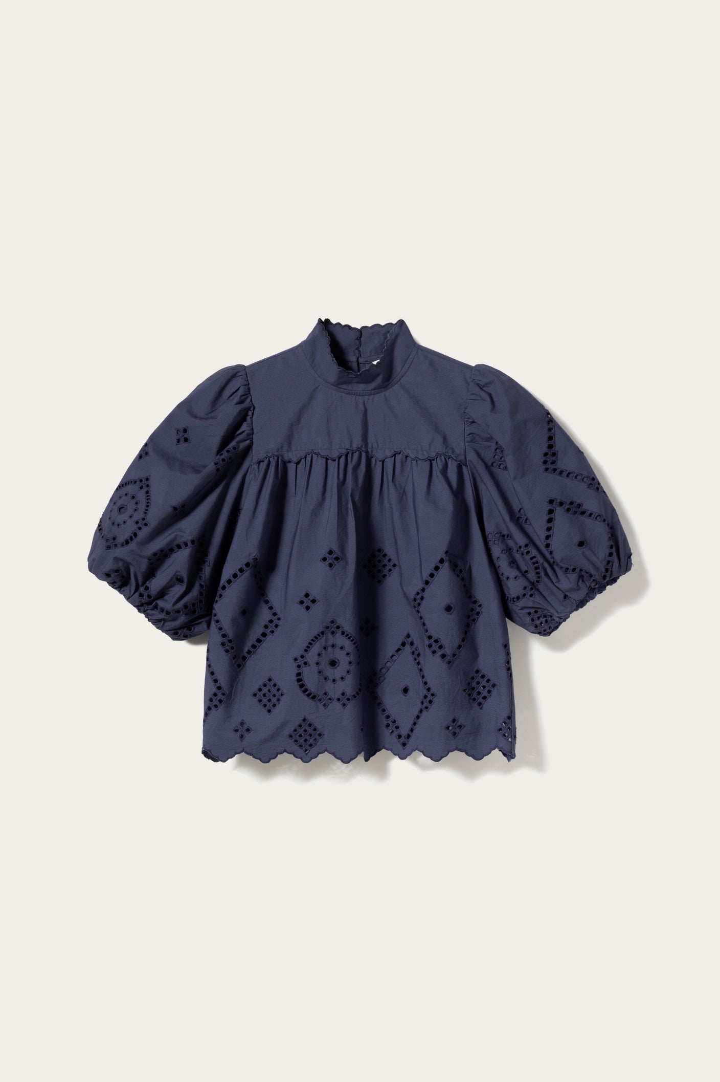 Die N-Marilyn Blouse ist aus weicher Broderie Anglaise gefertigt. Sie hat voluminöse Ballonärmel und eine Brustcutline mit feinen Spitzenapplikationen.