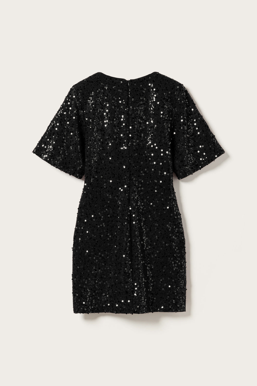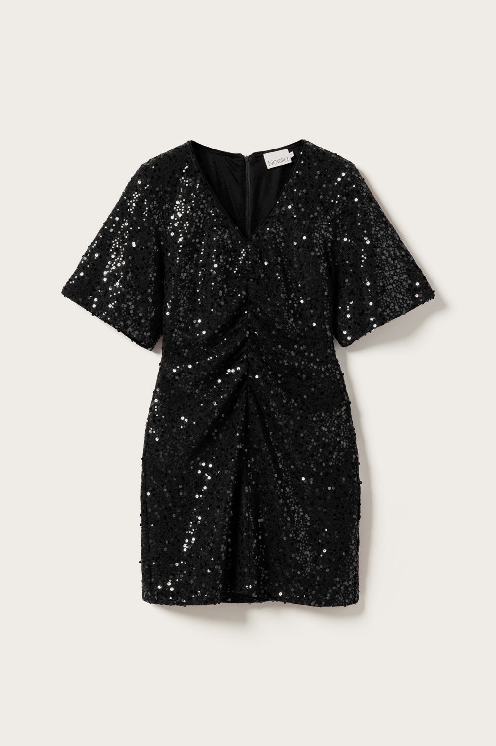 Soli Dress ist ein Partykleid mit kurzen Ärmeln, V-Ausschnitt, Pailletten und Smokdetail vorne. Das Kleid hat eine figurbetonte Passform und ist ideal als Partywear.